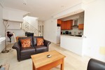 The ground floor offers a bright and spacious lounge–dining area with an open-plan kitchen and adjoining utility space. To the rear are two double bedrooms with fitted wardrobes, together with a family bathroom. French doors from one of the bedrooms open directly onto the rear tiled garden, a generous area perfect for outdoor dining and entertaining. To the front, there is an additional tiled garden with a raised, covered terrace.