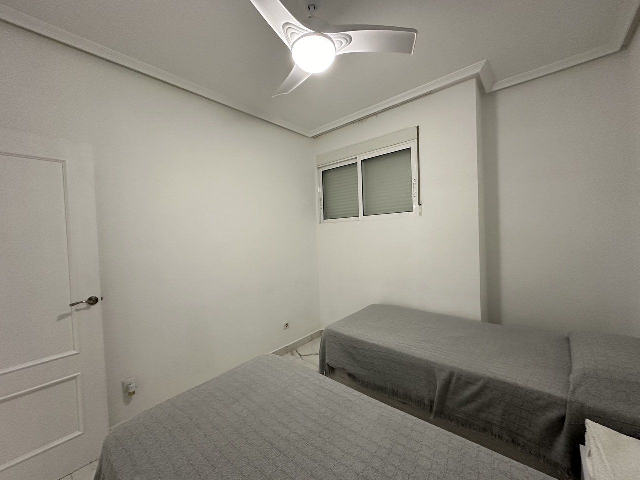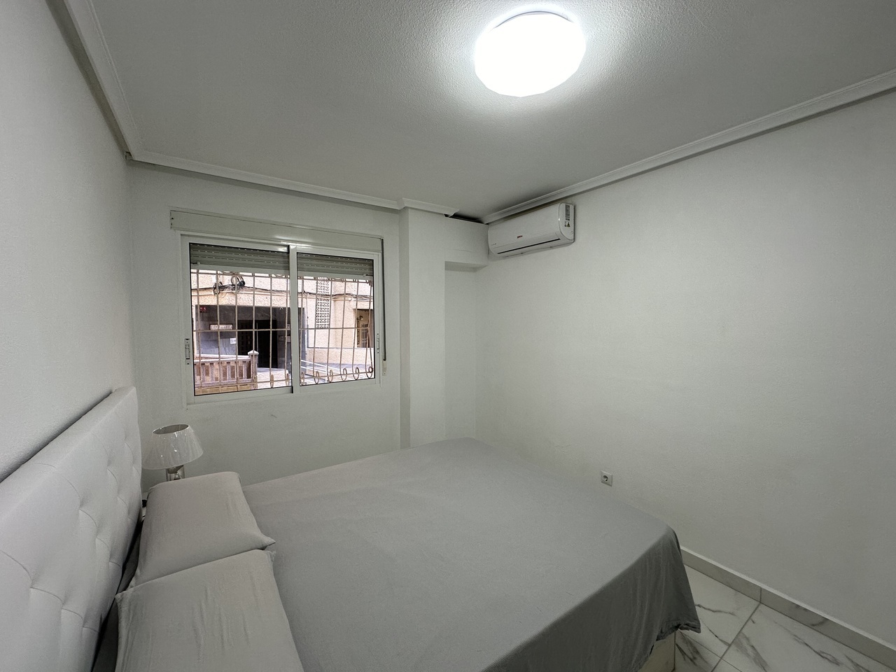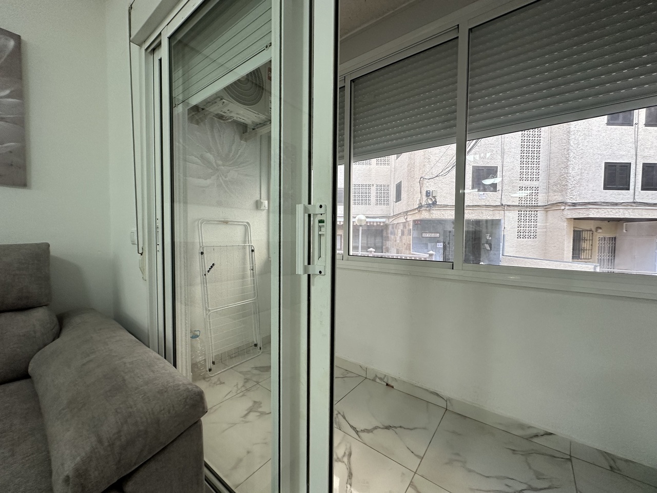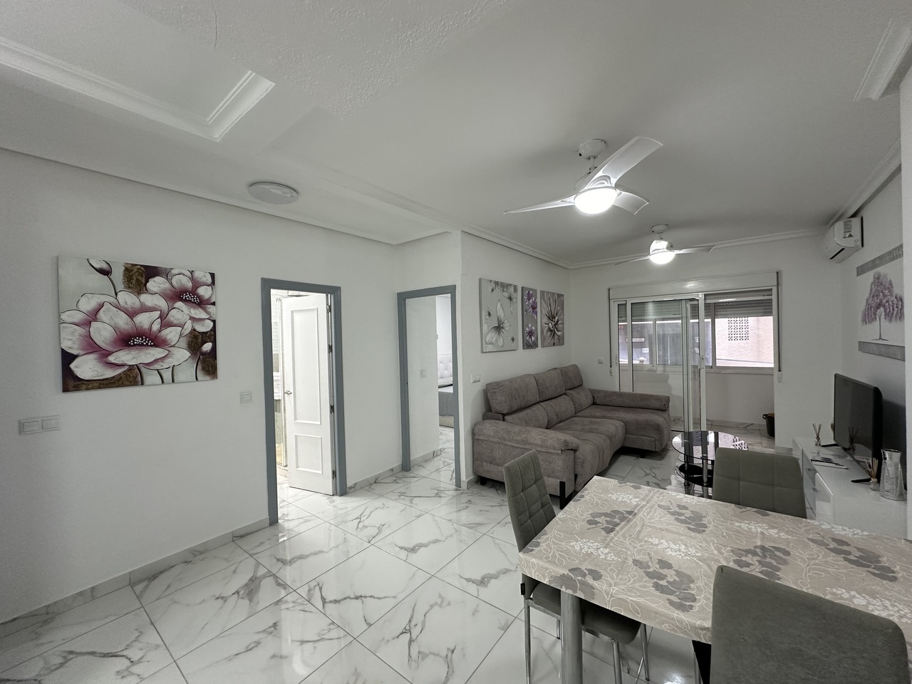 PRIME LOCATION 50m from Playa del Cura, Torrevieja beach is this elevated ground floor apartment. This fabulous 2 bedroom, 2 bathroom apartment has been reformed throughout with a brand new fully equipped kitchen along with 2 stylish bathrooms. The apartment has a huge living and dining room with access to a private glazed terrace with views down to the beach front. The property has two big bedrooms both with fitted wardrobes. The property has been tastefully reformed with modern floor tiling and is sold fully furnished and finished with air-conditioning. The property forms part of a very well maintained private complex where home owners have access to the communal showers and changing rooms to make it easy to wash-off the sand from the beach.