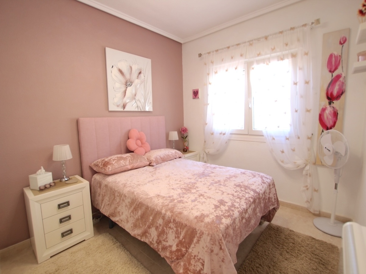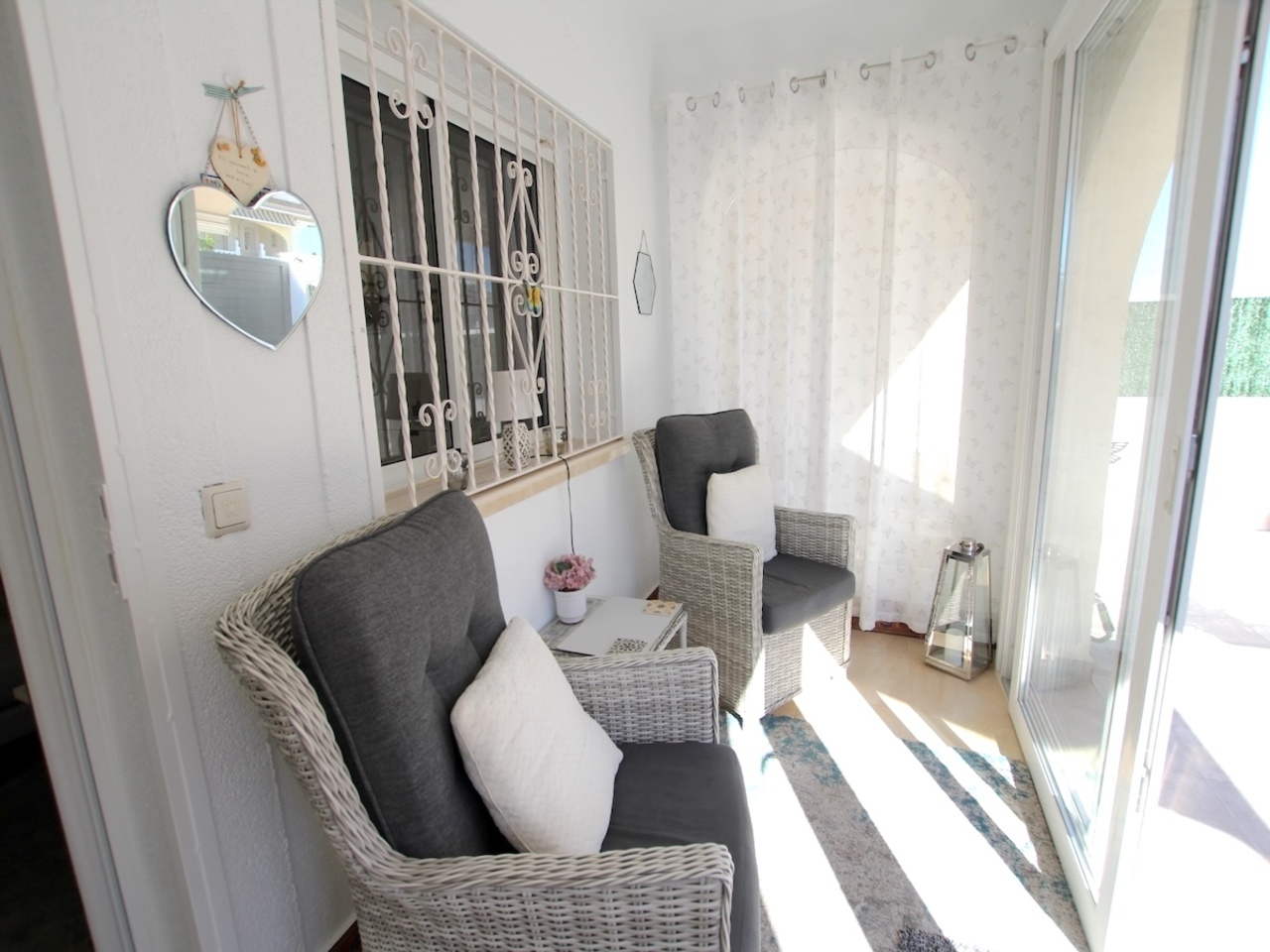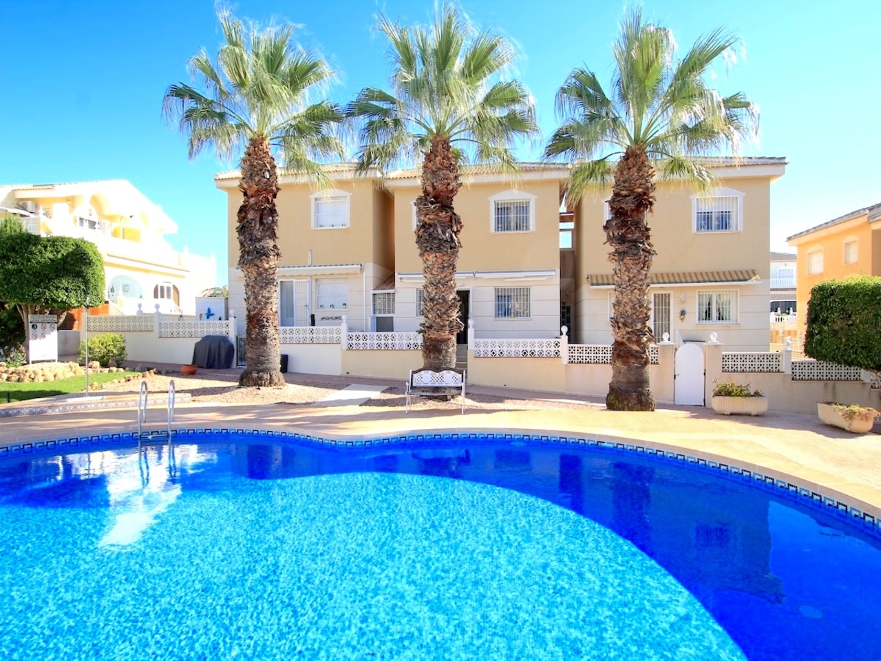 From the kitchen, access a fully tiled rear garden that opens directly onto the communal pool and gardens — perfect for entertaining or enjoying the Spanish sunshine.