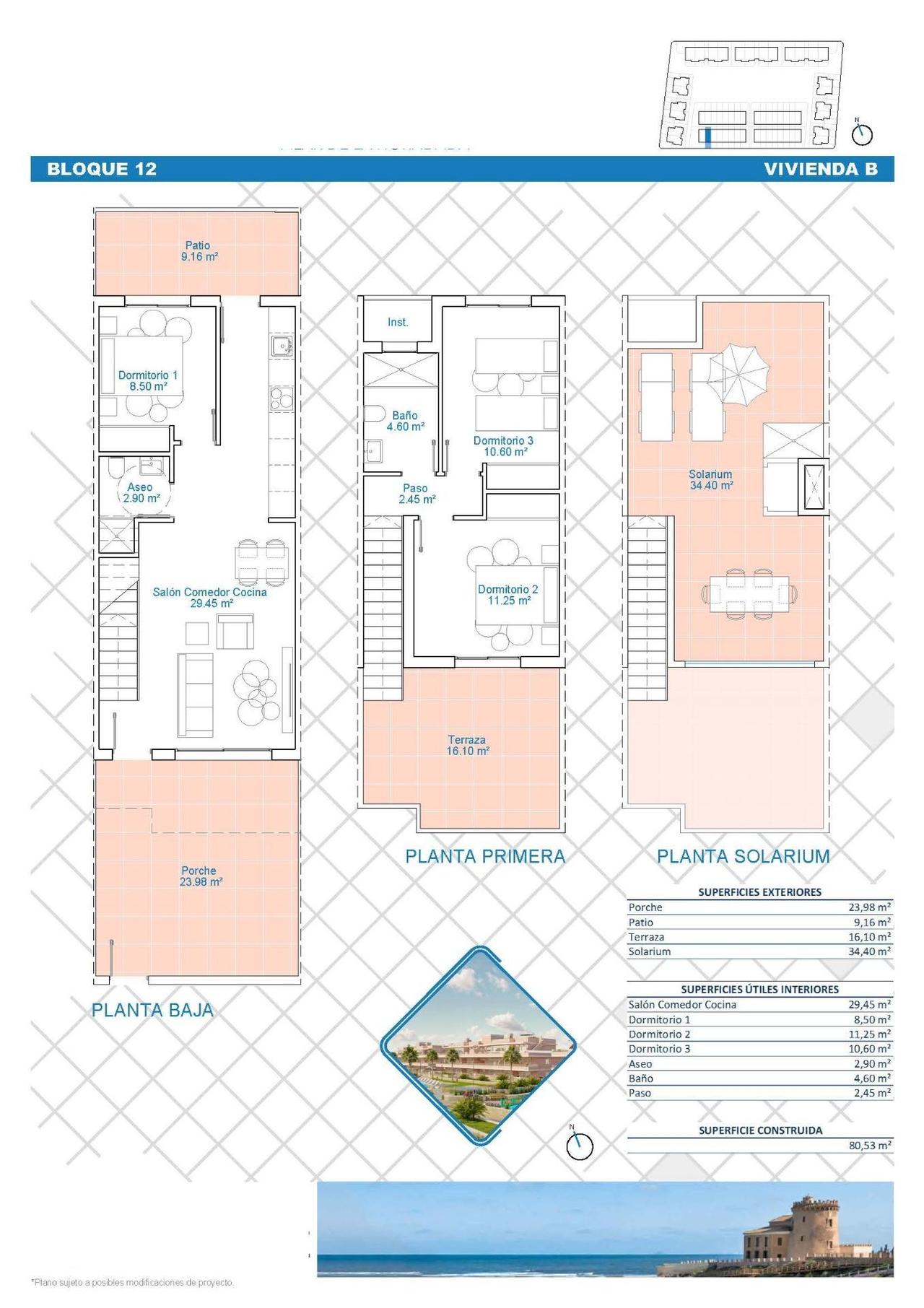 Exclusive New Development in Pilar de la Horadada, Costa Blanca, Spain Modern Homes Close to the Sea Discover this new residential complex in Pilar de la Horadada, a privileged location on the Costa Blanca. Only 2 km from the beach, this project offers a wide variety of 3 bedroom, 2 bathroom properties, with private parking included in the price. The development has spacious communal areas, including a communal swimming pool, landscaped gardens and a children’s play area, ideal for the whole family to enjoy. Different Typologies to suit your Lifestyle This development offers various housing options: Ground floor apartments with private gardens. Middle floor flats with large terraces. Penthouses with private solarium. Ground floor bungalows with private garden. Top floor bungalows with private garden and solarium. Townhouses and semi-detached houses with garden and solarium. All homes have been designed in a modern and functional style, using high quality materials and contemporary finishes. Equipment and Qualities The properties are equipped with: Pre-installation of ducted air conditioning. Exterior aluminium carpentry with thermal break and double glazing. Reinforced access door for greater security. Aerothermal system for efficient hot water production. Built-in wardrobes with LED lighting. Bathroom furniture and screens included. Pilar de la Horadada: A Privileged Place to Live in Pilar de la Horadada is a coastal town at the southern end of the Costa Blanca, with an exceptional climate and an excellent quality of life. Its lively main street offers a wide variety of shops, supermarkets, restaurants and essential services. Just a 5 minute drive away, you will find the stunning beaches of Torre de la Horadada and Mil Palmeras, with golden sand a lovely promenade. In addition, the area has cycle paths, hiking trails and multiple sporting activities. Distances to Key Points Lo Romero Golf Course – 5 km (10 minutes drive). Corvera Airport (Murcia) – 40 km (40 minutes by car). Alicante Airport – 55 km (55 minutes by car). Zenia Boulevard Shopping Centre – 15 km (15 minutes by car). Torre de la Horadada Marina – 3 km (5 minutes by car). Request More Information Today Don’t miss this opportunity to purchase a brand new property in one of the best areas of the Costa Blanca. Contact us now for more details and to arrange a viewing.