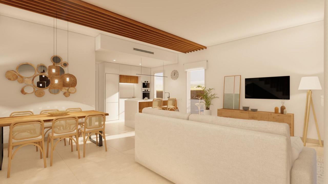 NEW BUILD VILLAS IN PILAR DE LA HORADADA New Build villas in Pilar de la Horadada. The interior of the villas consist of 3 bedrooms, 3 bathrooms en suite, large open plan living room with kitchen all located on two floors. The exteriors have a large landscaped garden with private swimming pool and parking space. New Build Villas where you will find the best Mediterranean style adapted to modern design. Residential consists of 17 villas located in Pilar de la Horadada, surrounded by all the services you need and just a few minutes from the beach. Pilar de la Horadada is a typical Spanish village in the most southern part of the Costa Blanca. The large main street has supermarkets, lots of shops, restaurants and bars and some lovely squares. The beautiful beaches of Torre de la Horadada and Mil Palmeras with fine sand promenade is just 5 minutes away. In Pilar de la Horadada there is also a well-developed cycling and walking path network, and there is also a large offer of various sports activities. Lo Romero 18 hole golf course is just a short drive from town. The airports of Corvera (Murcia) and Alicante are respectively 40 and 55 minutes away.