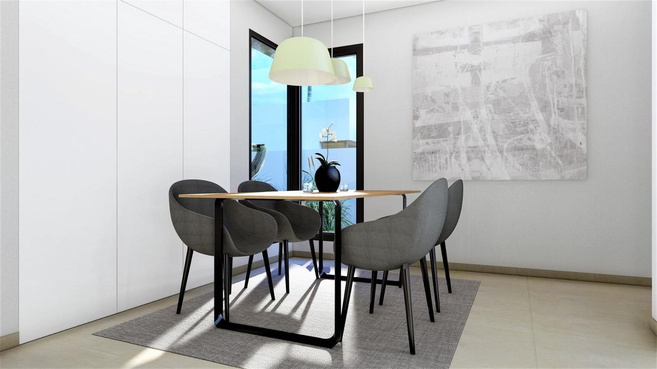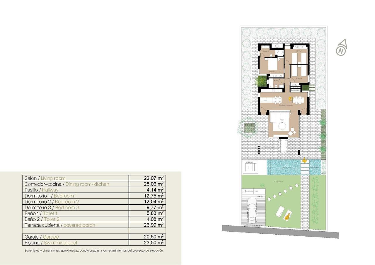 NEW BUILD VILLAS IN SAN FULGENCIO New Build villas San Fulgencio, just 5 km from the beach. The villas offer 3 bedrooms, 2 bathrooms and spacious kitchen, dining room, living room, swimming pool with waterfall and two pools: splash pool measuring 1.95×2.60 m and 0.6 m deep, and pool measuring 5.60×2.60 m, between 1 and 1.5 m variable depth. A large south facing porch allows the continuity of the living room with the outside, opening up to a modern and functional outdoor space where you can enjoy the private swimming pool, barbecue, chillout and large garden area that surrounds it. The simple and clear lines of the furniture contribute to its integration with the rest of the house. Wooden details add warmth to the atmosphere. Bathrooms where colour combined with natural and warm tones, create a cosy atmosphere, which together with the direct relationship with the outside ,allows you to connect with nature, achieving great moments of relaxation. The master bedroom has a private patio, which together with the light that penetrates through its windows, creates a relaxing atmosphere, perfect for rest and relaxation. San Fulgencio is a pleasant village with several restaurants and shops and the location is very good with its proximity to the fantastic beaches of La Marina and the slightly larger town of Guardamar. The town of San Fulgencio is situated around 30 minutes from Alicante-Elche airport, 6 km from the nearest golf course and just 5 km from the nearest beach.