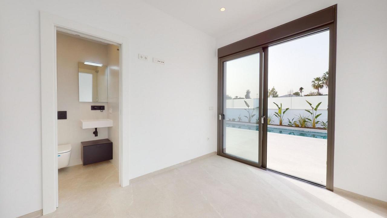 NEW BUILD VILLAS IN LOS ALCAZARES New Build residential of villas and townhouses in Serena Golf, Los Alcazares. Modern villas has 3 bedrooms, 3 bathrooms, open plan kitchen with living area, terrace, solarium, private garden with the pool and parking space. Fully fitted kitchen in white gloss or wood colour. Technological technological quartz. Stainless steel sink. Induction hob with integrated extractor fan, oven, microwave, washing machine, integrated refrigerator, integrated dishwasher. Air conditioning: Complete installation with FUJITSU ducts. Swimming pool: Dimensions according to the property, with steps, blue ceramic tiles and white LED lighting. Pre-installation for heat pump. La Serena Golf is located in the municipality of Los Alcázares, occupying an area of 60 hectares on the edge of the Mar Menor, a perfect natural environment to enjoy the best climate in Europe. Los Alcázares located in the Region of Murcia near the beaches of Mar Menor, where you can practice various water sports, surrounded by several golf courses. Here you can practice various water sports, surrounded by several golf courses and the city of Cartagena less than 15 minutes by car and 22 km from Murcia airport, therefore having a wide cultural, gastronomic and sports offer within reach.