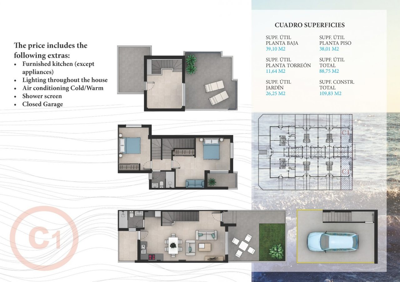 BEAUTIFUL TOWNHOUSES IN LA MANGA This residential is located at km 14 of La Manga on a unique plot, on the first line of the Estacio canal and just 50 meters from the Mediterranean Sea. Unbeatable for its situation, just 800 meters from the port of Tomás Maestre, where we will find a select leisure area with bars, cafes, restaurants, shops, supermarkets, pharmacies, banks, etc. This project have 28 magnificent duplexes with 2 and 3 bedrooms. In Residencial the homes have been designed, to take advantage of every corner of the house, as well as the care in choosing the materials and their design La Manga del Mar Menor is a natural strip of land surrounded by two seas, the Mar Menor and the Mediterranean Sea. To this rarity you can add the multiple leisure and free time options, restaurants, supermarkets, medical centers, pharmacies, nautical sports centers, golf courses. La Manga is located on the north coast of the Costa Calida and is a popular holiday destination for tourists. The narrow land strip separating the warm lagoon and the colder sea has a unique microclimate. It’s one of the most exotic areas in Spain. Corvera airport is about 1 hour drive away and Alicante airport about 2 hours away.port about 2 hours away.