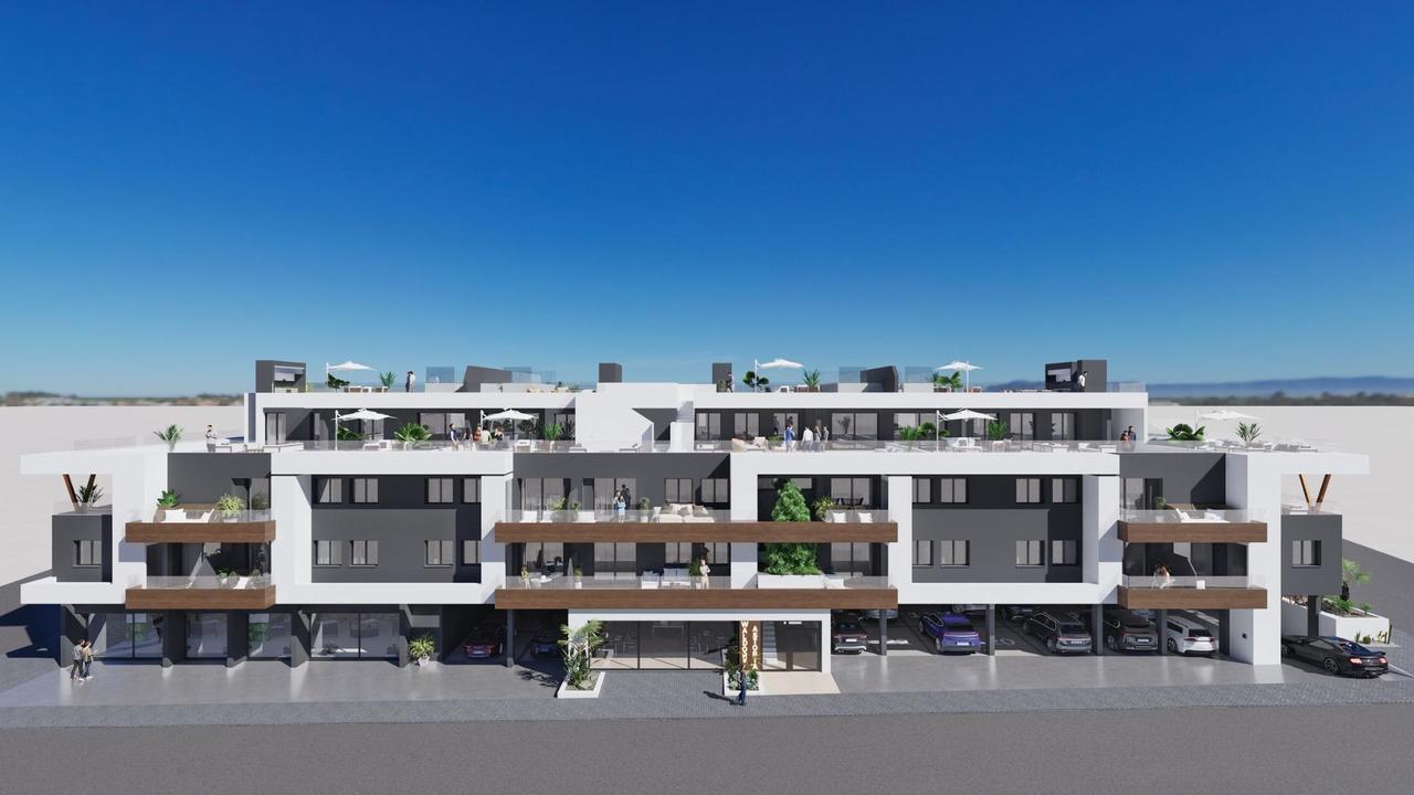 NEW BUILD RESIDENTIAL IN BENIJOFAR New Build residential with communal rooftop pool located in the centre of the charming village of Benijofar. You can choose modern apartments with terraces or penthouses with solarium. New Build modern properties with an open plan kitchen and living room, 2 and 3 bedrooms, 2 bathrooms, terraces. An options underground parking space at an extra cost. Benijofar it is a lovely village with a charming church and an attractive square/plaza located inland on the Southern Costa Blanca, close to the tourist resorts of Guardamar del Segura and Torrevieja. Benijofar is also a popular place to stay for the summer holidays as it is close enough to the coastal resorts yet quiet enough to be able to get away from it all. There are several golf courses close by as well as water parks in nearby Rojales and Torrevieja. The nearest and best beaches to Benijofar are about fifteen minutes away by car and are some of the best beaches on the Southern Costa Blanca, at Guardamar del Segura and Torrevieja. There are also regular bus services from Benijofar to Guardamar del Segura and Torrevieja with easy access to the beaches. 20 minutes drive to Alicante airport with regular flights all over Europe.