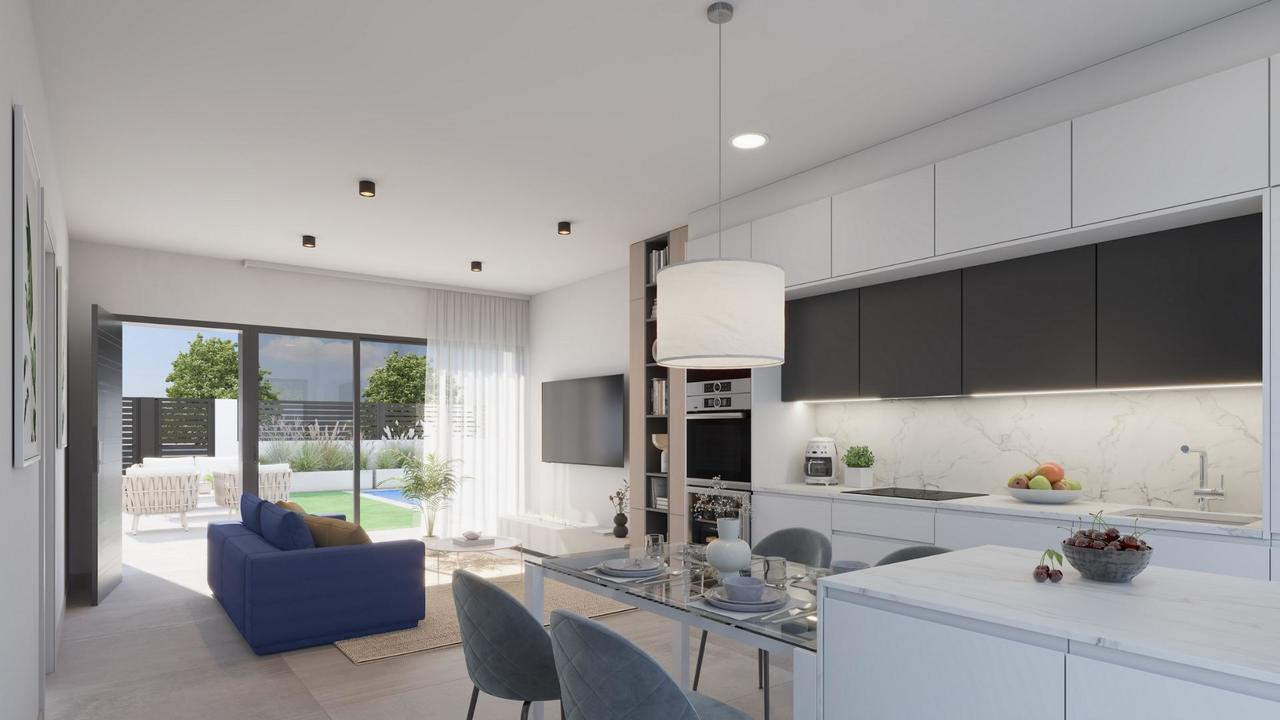 NEW BUILD VILLAS IN LOS ALCAZARES New Build development of 12 exclusive detached villas, each with a private pool and roof solarium, located just 150m from the beautiful Los Narejos beach and only a 2 minutes walk from the buzzing Rio Nalon strip with its wealth of bars and restaurants. Signature homes, built to the highest standard in one of the best locations on the Mar Menor. All villas have over 120m2 of living space plus private gardens of over 100m2, with off-road parking available on the plot and a 6m x 3m private pool with sunbathing platform included. All white goods included: fridge-freezer, oven, microwave, vitro-ceramic hob, extractor-fan, dishwasher, washing machine and mini-fridge in the summer kitchen. Pre-installation of ducted air-conditioning throughout. Interior and exterior lighting, minus ornamental lights. Motorized shutters. Downstairs comprises a bright living-dining area with open plan kitchen, a bathroom and an additional downstairs room of 13m2 which could be used as a third bedroom, a separate dining room or as a garage; this room will have panoramic glass doors which open outwards and which will allow a car to park inside if required (*although this internal space can be used for whatever the owners require and will be prepared as a bedroom, it will be put down as a garage on the deeds). There is also an exterior storage room and pool pump in the back patio. On the first floor there is master bedroom with en-suite bathroom, two fitted wardrobes and direct access to a balcony, plus another double bedroom with fitted wardrobes and access to balconies. A third family bathroom can also be found on the first floor. Stairs up from the first floor lead to a private roof solarium with summer kitchen with sink, work surface and cupboard containing a mini-fridge. Fantastic views from the solarium, thanks to its seaside location. Energy-efficient thermal insulation, plus a high level of soundproofing. Shower screens with two options available. TV and telephone sockets in the living room, bedrooms and in the solarium. Interior doors, carpentry and fitted wardrobes in white. Double-glazing with optimal solar protection. Hot water system via an electric, adjustable boiler and 1.5kw photovoltaic solar panels. Pre-installation for an electric car charger. Los Alcazares is a popular coastal town where you can find shops, bars, restaurants, supermarkets, chemists, a health centre, taxi rank and bus stops. Superb communication links, with the AP7 motorway close by. Murcia International Airport is less than a half hour’s drive (40km) and Alicante airport can be reached in under an hour (93km). The prestigious Roda Golf & Beach Resort, with its 18 holf Dave Thomas designed course, is just 2.5km away.