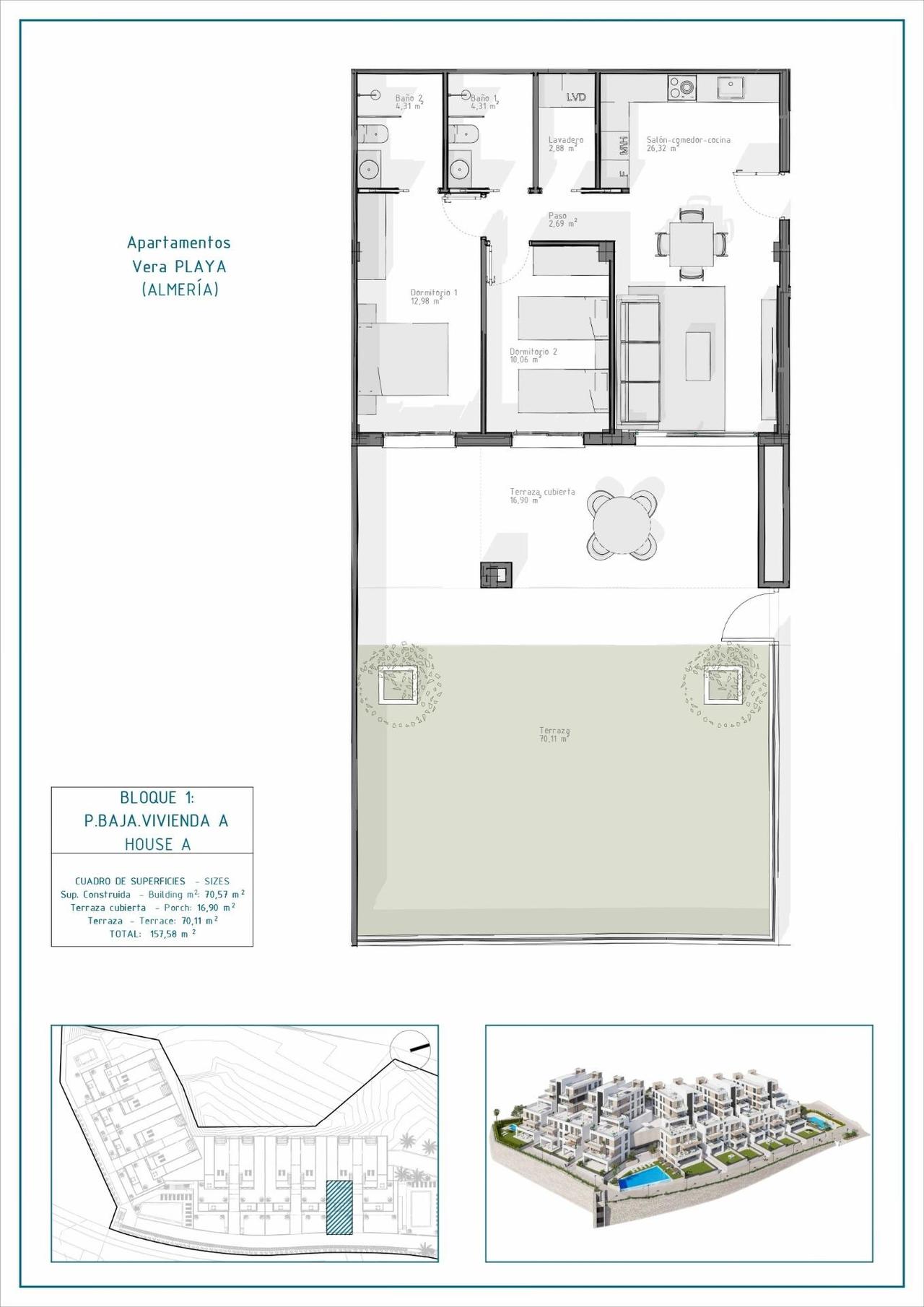 New Build Apartments in Vera Playa, Almería – Modern Homes Near the Sea Contemporary Living in Pueblo Salinas, Just 2 km from the Beach Introducing a stunning new residential development located in the sought-after area of Vera Playa, within the exclusive Pueblo Salinas urbanization. This modern complex offers a privileged lifestyle just 2 km from the beaches of Vera (Almería), boasting spectacular sea views and a peaceful Mediterranean environment ideal for year-round living or holiday enjoyment. Elegant Homes with Modern Comfort and Style This new development consists of 60 high-quality apartments distributed across 5 low-density blocks, with only two properties per floor. Choose between 2 or 3-bedroom layouts designed with functionality, comfort, and style in mind. Options include: Ground floors with private gardens Middle-floor units with spacious terraces Top-floor penthouses with large solariums including summer kitchen and pergola with solar panels. All properties feature: Open-plan fully equipped kitchens with integrated fridge, dishwasher, induction hob, oven, microwave, and extractor fan Bright living spaces and LED lighting throughout (except bedrooms) Motorized aluminum shutters in bedrooms Bathrooms with modern finishes, including towel heaters, shower trays with glass screens and built-in furniture Pre-installation of ducted air conditioning Aerothermal system for efficient hot water production Security entrance door Exceptional Community Amenities Residents will enjoy access to a wide range of amenities designed to enhance comfort and leisure, including: Two outdoor swimming pools perfect for the summer months One indoor heated pool for year-round use Private parking space and storage unit included with every property Pre-installation for electric vehicle charging at parking areas Prime Location with Excellent Connections Vera Playa is a popular coastal destination known for its wide sandy beaches and relaxed lifestyle. The development’s location provides easy access to essential services and attractions: Beach: 2 km Desert Springs Golf Resort: 8 km Vera town center: 5 km Garrucha marina and restaurants: 6 km Parque Comercial Mojácar: 10 km Almería Airport: 85 km (1 hour by car) Make Vera Playa Your New Home Whether you’re looking for a permanent residence, a holiday retreat, or a smart investment, these new build apartments offer unmatched value in one of the most desirable areas of the Costa de Almería. Contact us today for more information and to schedule your visit.