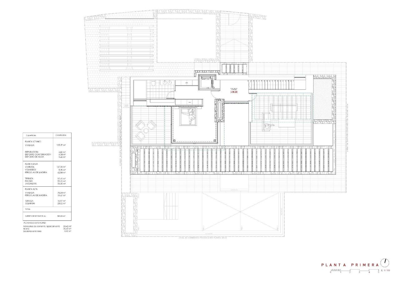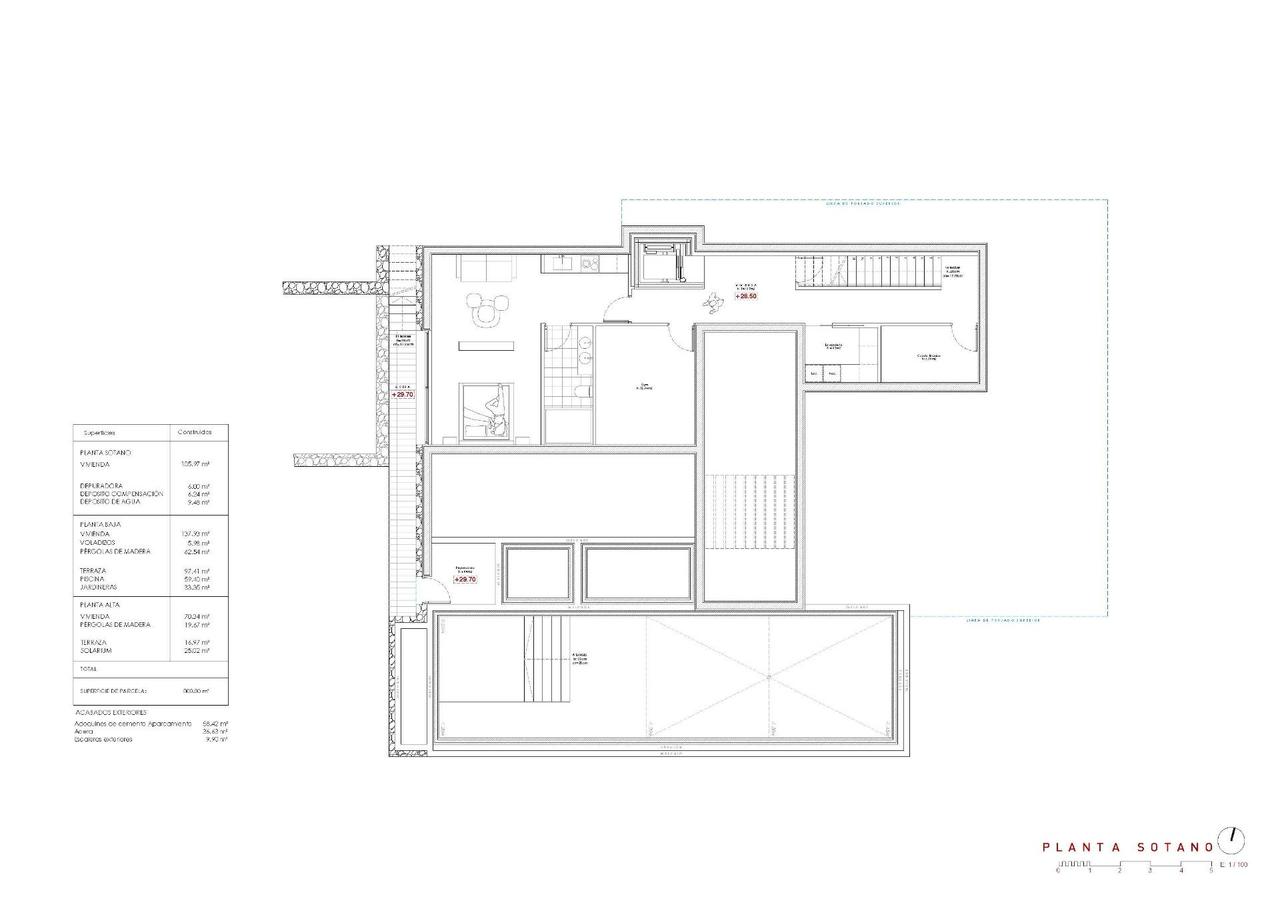 Contemporary Villa with Panoramic Sea Views in La Fustera, Benissa Costa This exclusive new-build villa, designed by a renowned architect and developed by a local developer with more than 20 years experience, sits on an 800 m² plot just a few steps from La Fustera Beach. Blending Mediterranean warmth with contemporary elegance, the architecture combines natural stone, wood, and soft neutral tones, integrating seamlessly with the coastal landscape. With a total built area of 716 m² distributed over three levels – basement, ground floor, and first floor – the villa offers a perfect balance between functionality, design, and comfort. Basement Level The lower floor of 105.97 m² is designed for both practicality and leisure. It includes a fully equipped gym, laundry room, and technical areas, with the option to adapt additional spaces as a wine cellar, cinema, or multipurpose room. This level also houses the pool’s filtration system and water tanks, ensuring efficient management of all technical installations. Ground Floor The main level, with 137.93 m², unfolds in a bright open-plan layout that captures the essence of Mediterranean living. The spacious living room, dining area, and kitchen open through large floorto-ceiling windows onto the main terrace and infinity pool, framing incredible panoramic sea views that define the character of this home. Two double bedrooms, a full bathroom, and a guest toilet complete this floor, providing comfort and functionality. Outside, a wooden pergola shades the outdoor lounge and dining areas, surrounded by lush gardens, sun terraces, and a 59.40 m² infinity pool that visually merges with the sea. First Floor The upper level, with 70.19 m², is reserved for the master suite – a private retreat featuring a walk-in closet, en-suite bathroom, and a large private terrace with breathtaking views of the Mediterranean Sea. A second bedroom or office space completes this floor, which also provides access to a 25.02 m² solarium, ideal for relaxing under the sun and enjoying the serenity of the surroundings. Exterior and Location Located on a quiet residential street surrounded by modern villas, this property enjoys an exceptional position just a 3-minute walk from La Fustera Beach (150m), the Mandala Beach Bar & Restaurant, and essential amenities such as supermarkets and local services. Designed with an emphasis on light, space, and seamless indoor-outdoor living, this villa embodies the modern Mediterranean lifestyle – elegant, relaxed, and in perfect harmony with its spectacular panoramic sea views. Secure your dream villa in La Fustera, Benissa Costa, and embrace the ultimate Mediterranean lifestyle with breathtaking sea views and unmatched comfort.