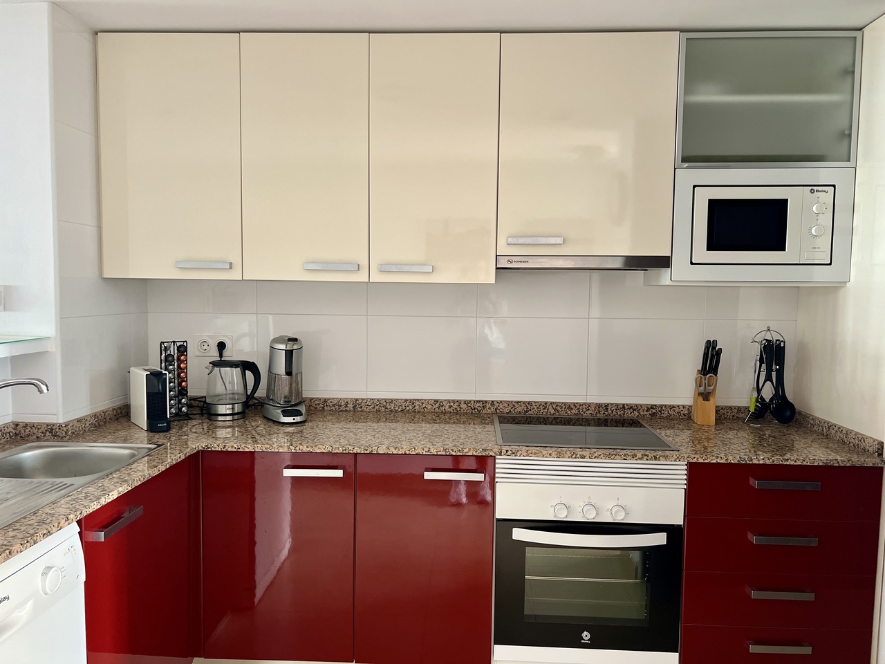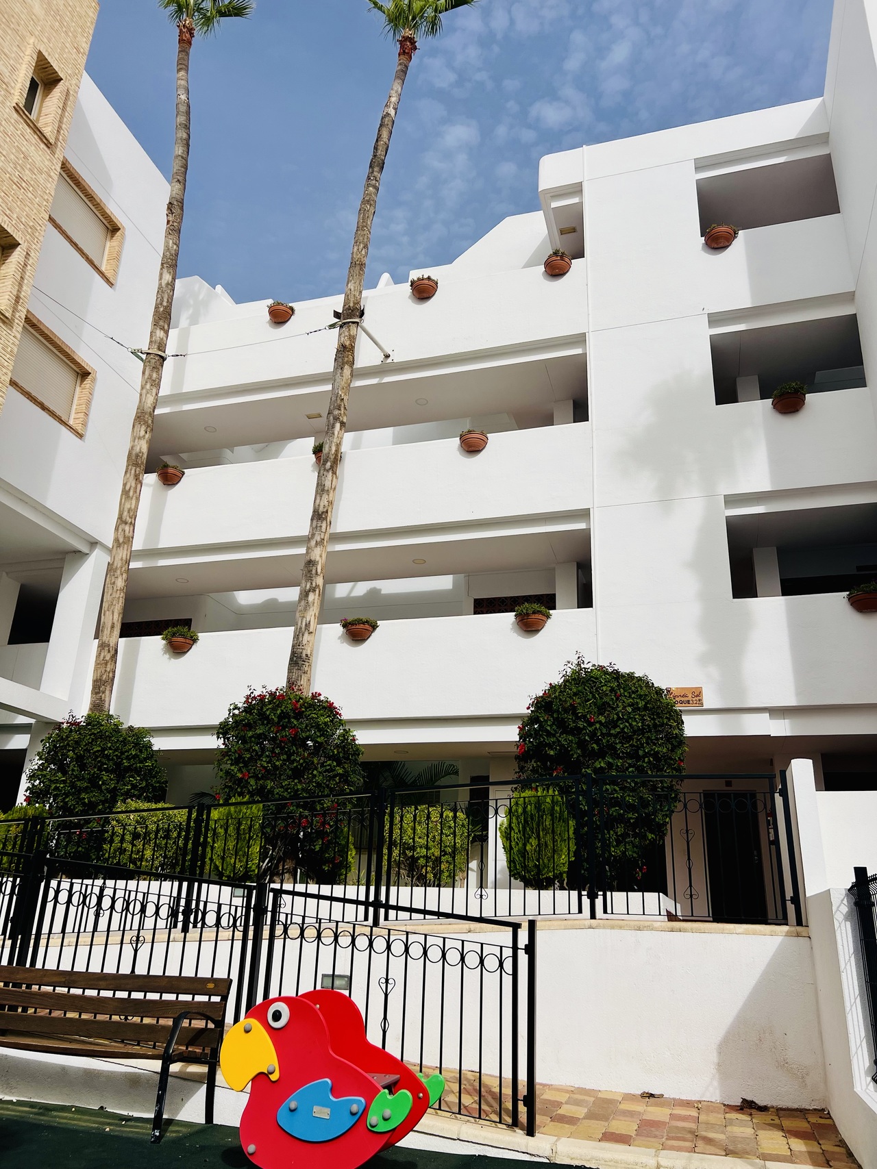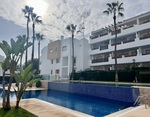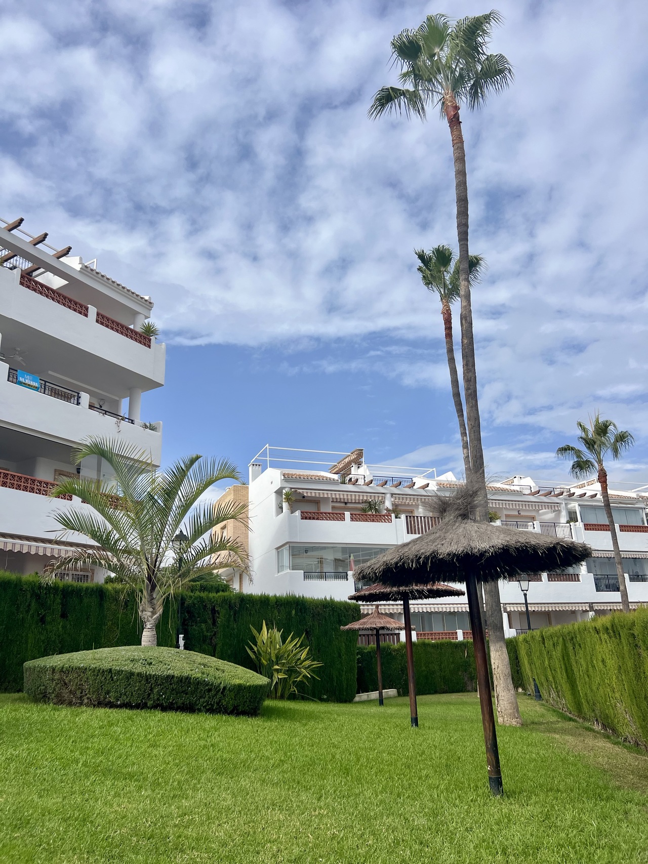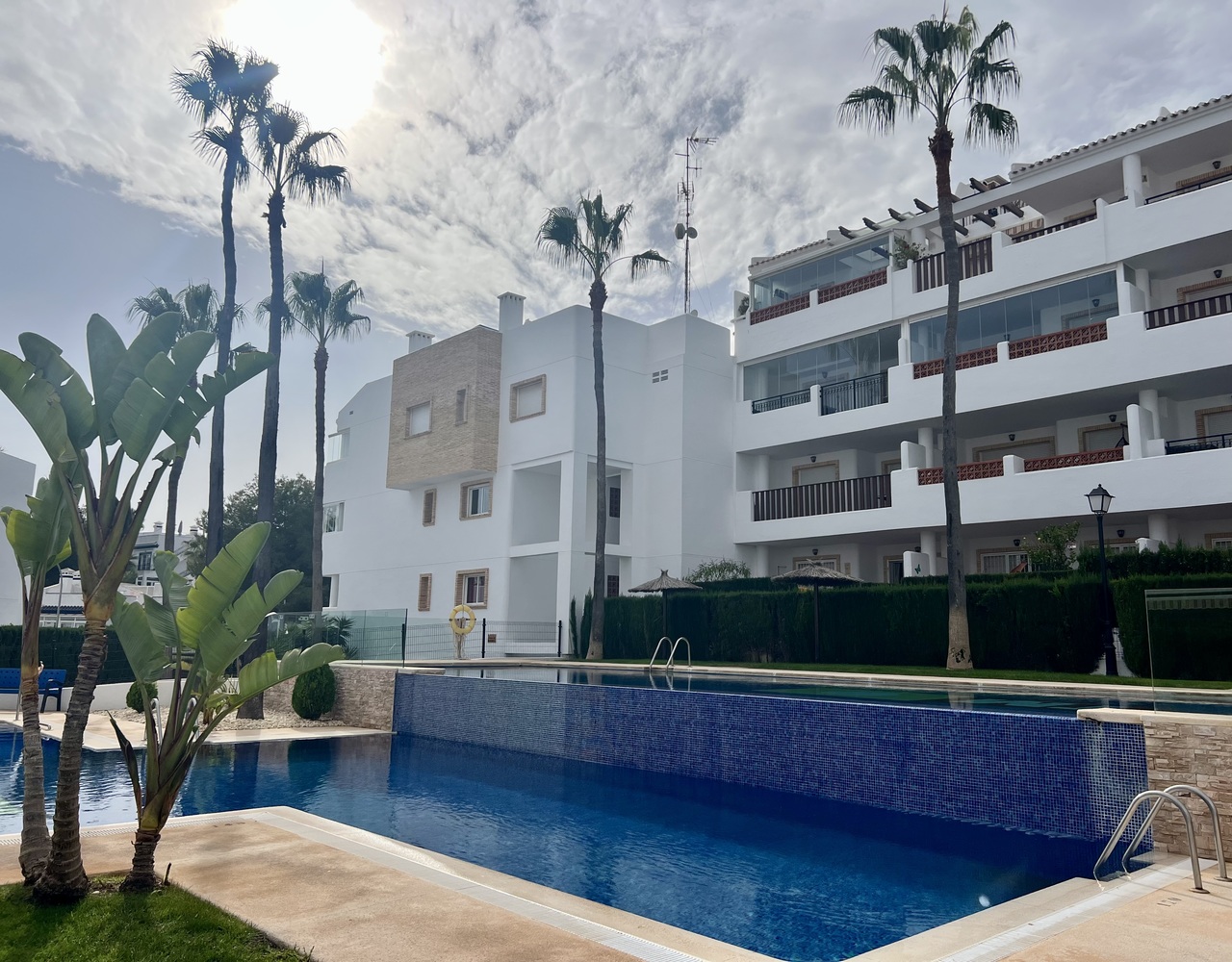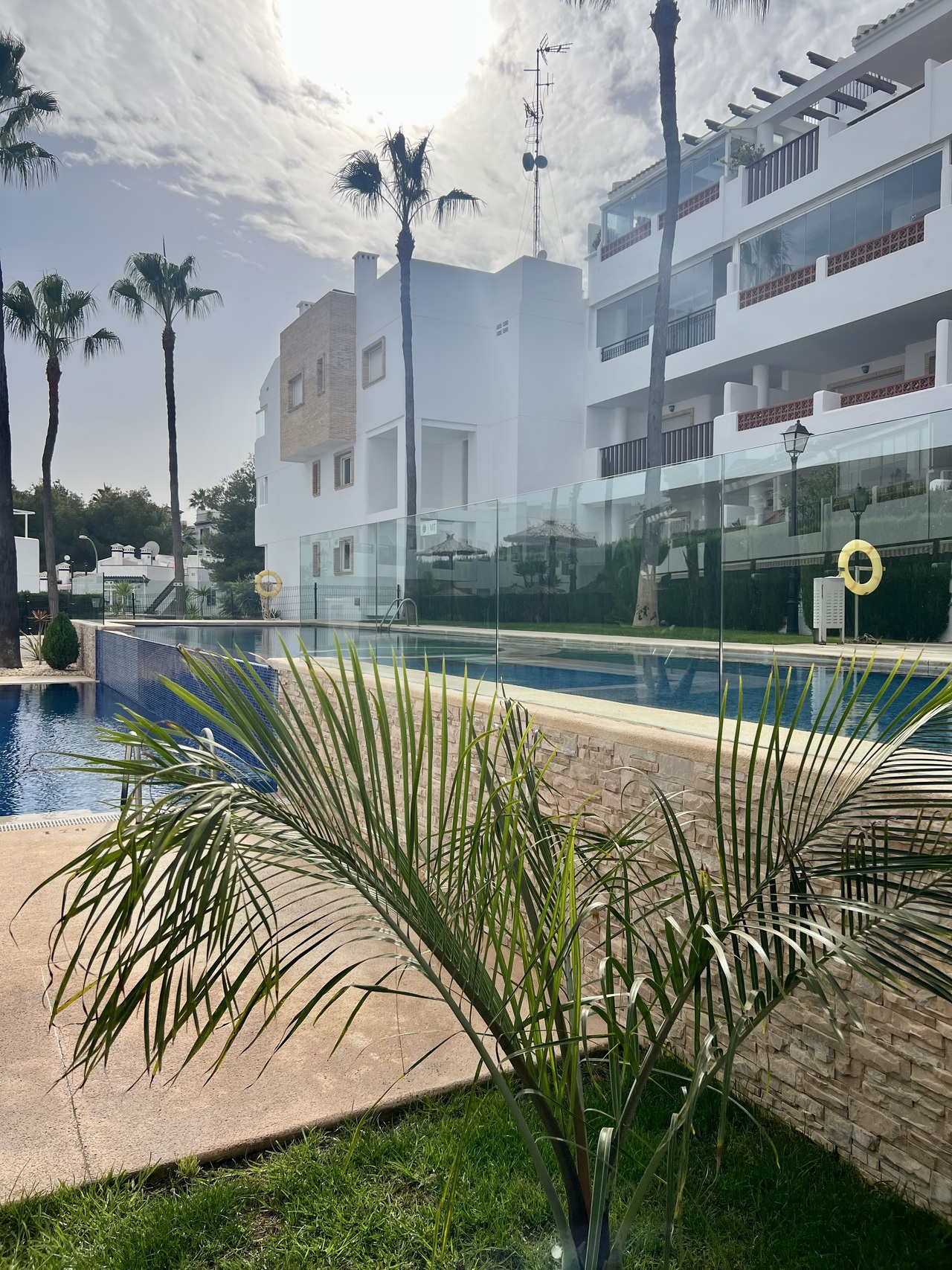 The apartment is bright and well laid out with an open plan living/dining room and fully equipped kitchen, two bedroom with fitted wardrobes, two bathrooms, and a sunny balcony. There is an intercom system to the street, air conditioning (hot/cold) throughout the property and the community is gated with attractive gardens and large impressive communal garden and swimming pool. Allocated parking space and storage room in the garage is also included in the price.