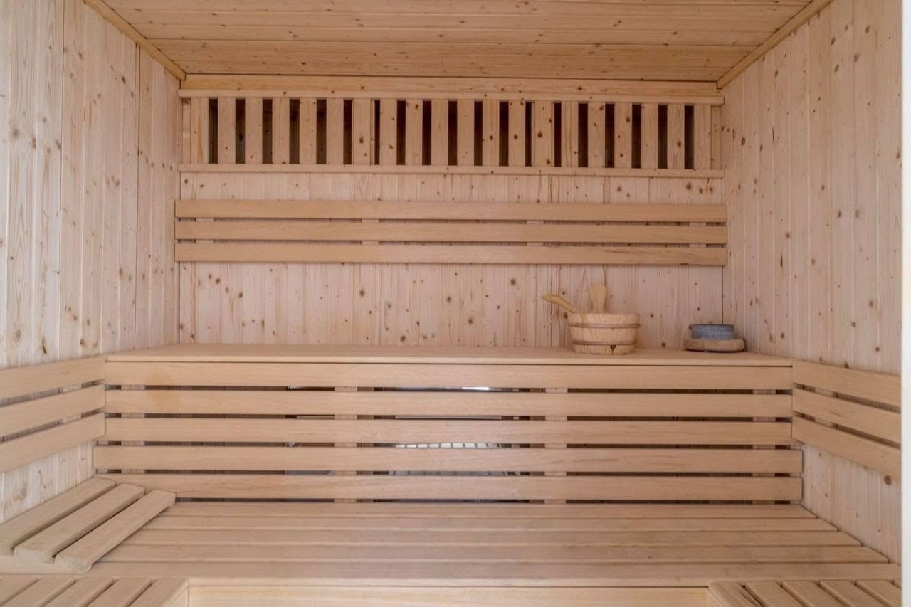 Large shared green area (17,000 m²) with three communal swimming pools, including one with a lovely pool bar and another that is heated for winter use. Two additional swimming pools for children, six jacuzzis, relaxation areas, a sauna, a gym, and a children’s play area.