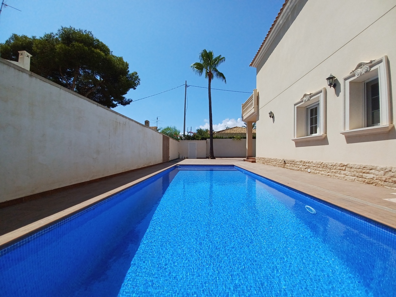 This fabulous home is located in a prime location in Cabo Roig, just 400m from the beach. This stunning villa has been beautifully refurbished throughout to a high standard with underfloor heating in all 4 bathrooms, air conditioning in all rooms and ceramo granite flooring throughout. Set on a 518m2 plot the property consists of:OUTSIDE High walls around the boundaries, with new non slip floor tiles, 8×6 infinity pool, space for parking 3 cars off road, shower, brick built storage room, room to make outdoor entertaining area on a 518m2 plot. LOUNGE 6.51 X 5.81 m2 Wood burn fire and marble fire surround fire place, windows to the side, door to the cloakroom with low flush toilet and sink. To the rear of the property there are patio doors that leads out onto the outdoor dining area. KITCHEN 1.91 X 5.90 m2 Fully fitted in cream shaker style units with ceramic hob, electric oven, fridge freezer, dish washer and washer all made by Bosch. Granite work tops and splash backs, electric boiler, window to the side and door to the rear side leading to the garden. Possible to make a garden kitchen. BEDROOM ONE 2.44 X 4.33 m2 Window to the side, air conditioning installed. This room could be used as office or dining room. Has all pre-installed internet and communication cables. BATHROOM 3.65 X 1.77 m2 Under floor heating, shower cubicle, sink, low flush toilet, bidet and window to the side. Tiled tastefully throughout in cream. BEDROOM TWO 3.36 X 3.67 m2 Patio window to the front leading to front balcony and air conditioning. FIRST FLOOR BEDROOM THREE 3.24 X 3.92 m2 with ENSUITE 3.65 X 1.87 m2 Patio door leading onto private balcony, air conditioning and door to en-suite. En-suite with under floor heating, tiled throughout, walk in shower, low flush toilet, bidet and glass sink unit. BEDROOM FOUR 3.74 X 3.58 m2 with ENSUITE 3.60 X 1.92 m2 Patio door to the rear leading onto rear balcony of 20m2, air conditioning and door to en suite. En suite with under floor heating, walk in shower, low flush toilet, bedit and double his and hers vanity sink unit. BEDROOM FIVE 3.87 X 3.90 m2 with EN SUITE 3.55 X 1.92 m2 Patio window to the front leading to the front private balcony, air conditioning and door to ensuite. Ensuite with bath and overhead shower, low flush toilet, bidet, vanity sink unit, under floor heating and tiled throughout. There is a window to the rear. All fixtures and fittings are brand new, never used and to the highest quality. 2ND FLOOR SOLARIUM With stone balustrade, floor tiles and sea views. Sunny and private. The property should be view to see the quality and finish. To arrange appointment please call us today