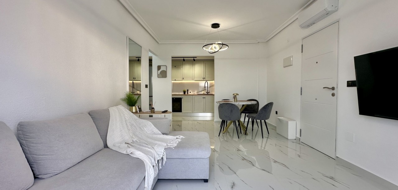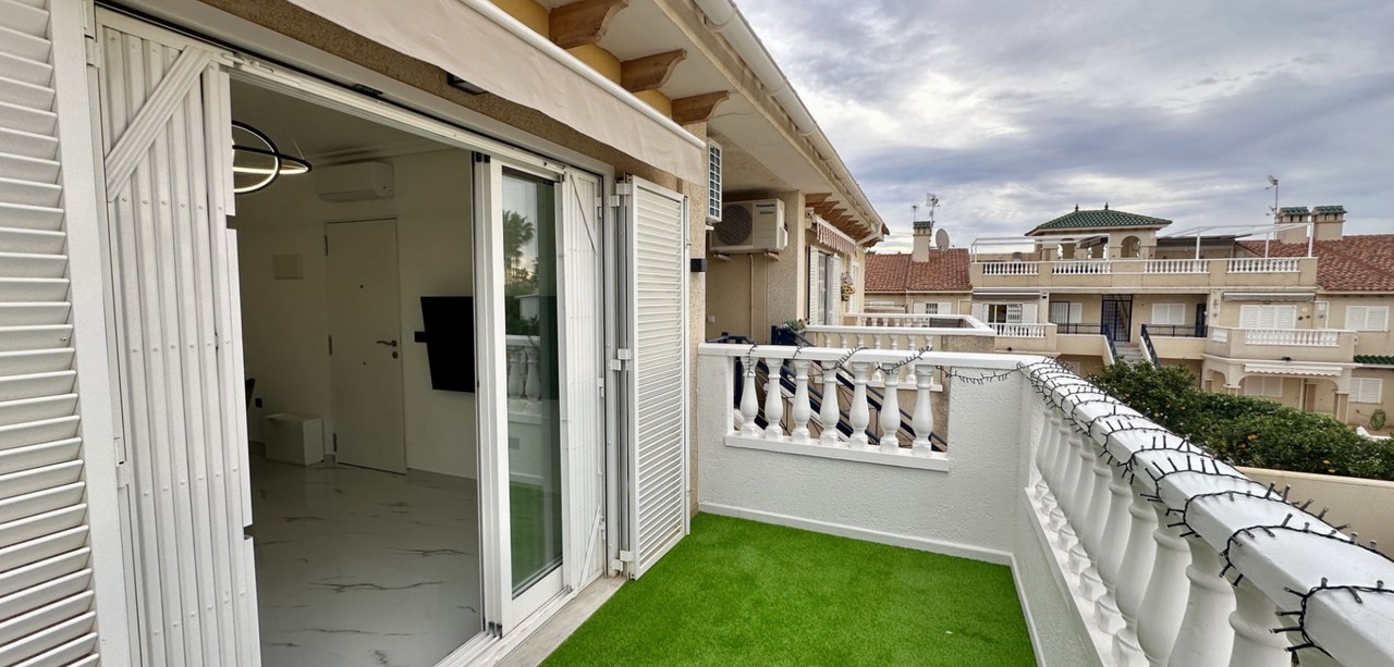 Discover this fully renovated and bright penthouse with exclusive interior design, located in the desirable Zeniamar 1 residential complex. Offering 52 m² of modern living space, the property features a southeast orientation and stunning direct sea views. Positioned on the first floor with a private entrance, it includes a storage room and access to a beautiful community with a swimming pool and green areas. Inside, the home consists of 1 bedroom, a contemporary bathroom with walk-in shower, and a cozy living space that flows to a 6.5 m² balcony. High–quality finishes include LG and Samsung appliances, inverter air conditioning, 55” AI smart TV, washer–dryer, underfloor heating, smoke detectors, and Wi-Fi video surveillance. Perfectly located within walking distance to landscaped parks, restaurants, paddle courts, mini-golf, and both municipal and Scandinavian schools. Beaches and Zenia Boulevard shopping center are just a 5-minute drive away—making this the ideal holiday home, residence, or rental investment.