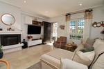 Inside, the ground floor features a bright and spacious lounge-dining area with a feature fireplace, a fully renovated modern kitchen with utility area, and a guest WC. Both the front and rear gardens have been newly retiled, and the elevated front terrace — complete with retractable sun awnings — overlooks the pool area.