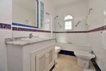 Upstairs are two double bedrooms with fitted wardrobes and a family bathroom. The main bedroom opens onto a private South-facing balcony with wonderful sea and pool views. Internal stairs lead up to a large private roof solarium offering panoramic Mediterranean views — perfect for relaxing or entertaining.