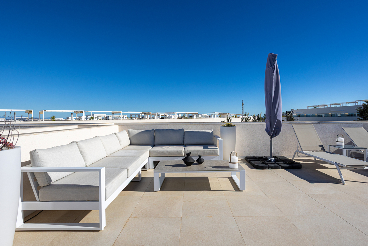 Modern Furnished Apartment with Unique Rooftop Terrace and Panoramic Lake Views – Los BalconesThis tasteful and move-in-ready apartment in Los Balcones combines modern comfort with exceptional outdoor living. With two terraces and a spacious 74 m² solarium featuring an outdoor kitchen and pergola, and a total of 188 m² of living space, this home offers an unparalleled Mediterranean lifestyle. The beautifully landscaped community with a large communal pool completes the picture.Living in Los BalconesLos Balcones (Torrevieja) is a sought-after area for those who want to combine tranquillity, comfort, and natural surroundings. The residence is set within a green environment with mature trees, well-maintained paths and a welcoming swimming pool. From the apartment, you enjoy panoramic views of the Torrevieja salt lake, one of the region’s most iconic landscapes on the Costa Blanca.Layout & ComfortLocated on the first floor, the apartment offers a modern and fully furnished interior of 84 m², complemented by spacious terraces and a generous rooftop solarium.Fully furnished and tastefully decoratedModern interior with high-quality finishes3 bedrooms with air conditioning2 bathroomsFront terrace of 21 m² and rear terrace of 9 m²74 m² solarium with outdoor kitchen, pergola and stunning viewsSmart-home system (domotics) for added comfortAlarm system, storage room and private parking spaceThe entire property feels bright, airy and refined — perfect as a second home, rental investment or permanent residence.Outdoor Living & ViewsThe solarium is the true highlight of this property: an inviting space to relax, cook, entertain guests or simply enjoy the sunshine at any moment of the day. The outdoor kitchen and pergola make it a highly functional rooftop haven. Both terraces at the front and rear of the apartment offer additional cosy outdoor spaces.The view over the salt lake provides a rare sense of peace and offers a unique play of colours during sunrise and sunset.Location & SurroundingsNearby you’ll find supermarkets, restaurants, sports facilities and Torrevieja’s hospital. The beaches of Torrevieja and Orihuela Costa are just a short drive away, as is the popular La Zenia Boulevard shopping centre. A quiet, safe and practical location — ideal for families, couples or investors.Key Details188 m² total area84 m² interior living space74 m² rooftop solarium with pergola & outdoor kitchen21 m² front terrace9 m² rear terrace3 bedrooms, 2 bathroomsFully furnished, domotics, air conditioning, alarmPrivate parking & storage roomLarge communal swimming poolPanoramic views over the salt lake