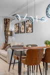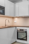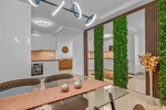 The interior is finished in a modern, minimalist style, blending elegant white tones with warm wood and touches of natural greenery. The apartment is sold partially furnished, as shown in the photos, leaving room for the new owner to personalize the space to their own taste.