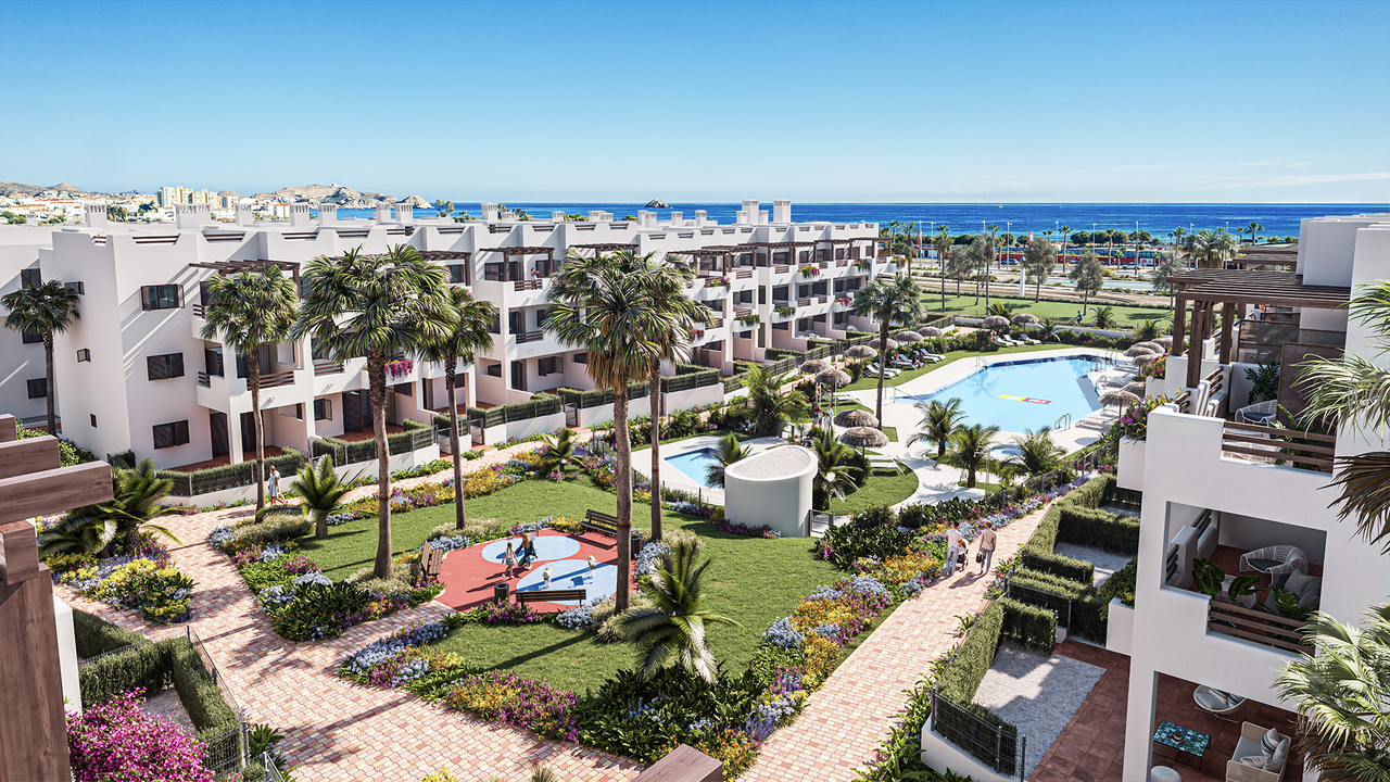 New build apartments (366 in total) in Mar de Pulpi, Almería with 1, 2 and 3 bedrooms featuring communal areas including gardens, community swimming pools, jacuzzis and children’s play areas. With a tranquil location in a privileged natural setting. This new phase offers homes designed to enjoy the Mediterranean climate, the tranquility of the surroundings and the comfort of an established residential development with all services at your fingertips. The residential complex is located very close to La Entrevista and Los Nardos beaches, and just minutes from Águilas, Cala Cocedores and the golf courses: Aguilón Golf and Desert Spring Golf.