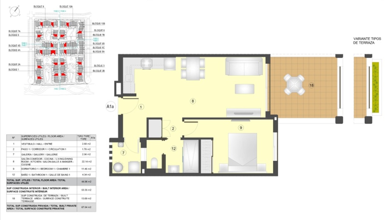 Very well presented properties with a private garden for the ground floor units and a private solarium for the penthouse units, a bright spacious living/dining room, a modern open plan kitchen with utility room, one bedroom with fitted wardrobes, one bathroom, air conditioning (hot/cold) throughout the property, a large terrace, and a private parking space.