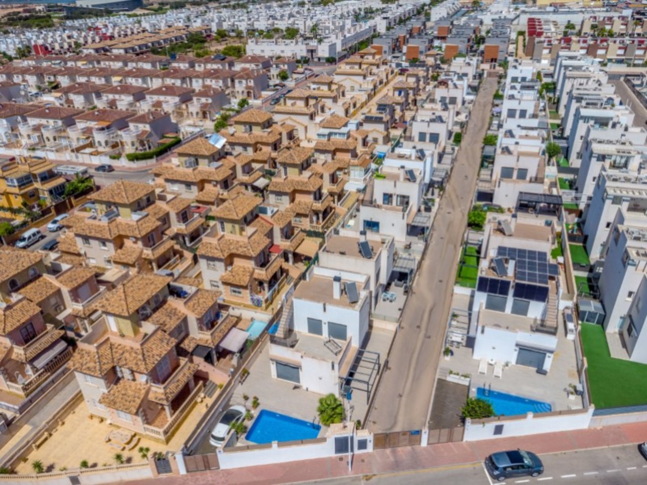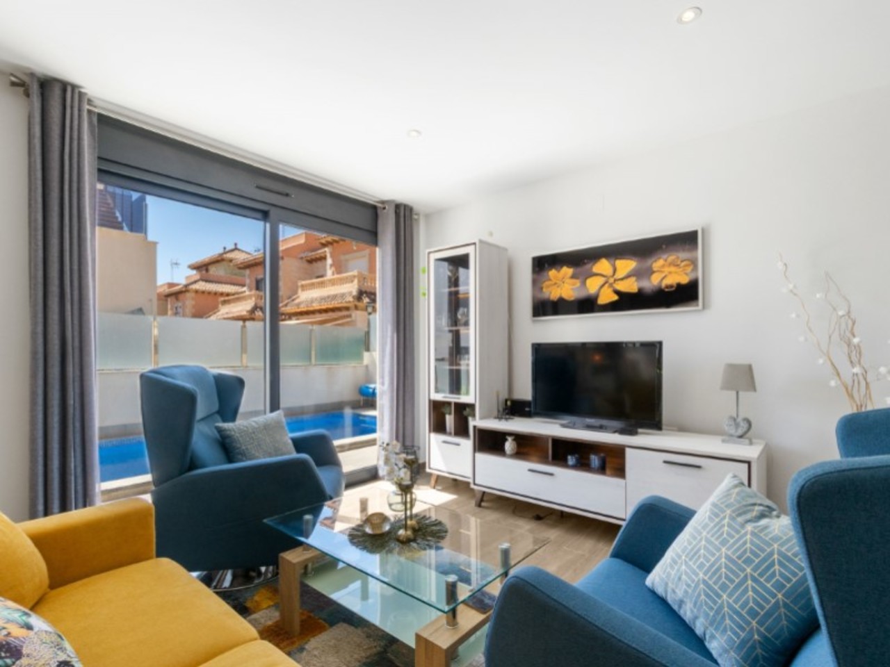 This is truly a gorgeous modern villa with 5 bedrooms and 3 bathrooms, with spacious plot and inviting terraced private pool, designed for the modern family. The home is located in a small closed urbanisation with only 18 houses, was ready for occupancy in 2017. The owners in this urbanization have approved rentals, so if you are looking for a home that you can also rent out when you are not using it yourself, this is the perfect choice.When you enter this elegant home, you will be greeted by an open plan living area, with an impressive living room with large windows, an open plan kitchen that is also fully equipped and with generous storage space. On this floor we also find one bedroom with a custom-made wardrobe, a luxurious bathroom with shower, and a very practical laundry room, with direct access to the garden behind the home.On the floor above there are two further bedrooms complete with built-in wardrobes, a nice bathroom with shower, and a large and spacious terrace, from this terrace there is a staircase up to the lovely roof terrace, with great views towards the city of Torrevieja and the well-known salt lake.But it doesn’t stop there, there is also a basement, here there are 2 more spacious bedrooms, a stylish bathroom with shower, and a large living room that currently serves as an additional living room.On the plot there is a lovely swimming pool, with an installed heat pump if you prefer a comfortable water temperature also in winter.Several outdoor areas, here you can move from or to the sun, behind the home there is also a large practical storage room. The villa has modern amenities, including advanced air conditioning, an efficient ventilation system through ducts, and automated electric blinds. The entire main floor is powered by a sophisticated home automation system. Mosquito nets are installed in the master bedroom and bathroom on the 2nd floor, the main entrance door and the large glass sliding door on the second floor. There is a descaling and drinking water system in the kitchen and bathroom on the first floor. The hot water is efficiently heated with solar panels. The property is sold fully furnished and equipped, ready to move straight into.Parking on the plot.Few minutes walking distance you will find a variety of shops such as grocery, bakery, optics, cafes to name a few10-12 minutes walking distance you will find the well-known Friday market, water park and large sports facilities but can use.Bus connections in the area, which take you to, among other things. centre of Torrevieja or La Mata beach for those who do not want to walk.TorreviejaTorrevieja is a city in the province of Alicante in the Comunidad Valenciana region of Spain. The town is a popular tourist destination located about 40 minutes drive from the metropolis of Alicante and the airport. Torrevieja was originally a small fishing village, and is today one of Europe’s largest salt producers, Torrevieja has previously been called the ‘salt city’, but in recent years the city has also been named a ‘sports city’, this because of the large sports arenas that have been built in recent years. As a result of this fantastic investment, Torrevieja became one of four host cities during the 2021 Women’s Handball World Championship.When you live in Torrevieja, you are within a short walking distance to white, elongated sandy beaches with the ‘blue flag’ stamp, as an indication of, among other things, high water quality. In the immediate area and often ‘right outside’ the door you will find a large selection of local shops, restaurants, cafes, shopping centres, green parks, the harbour and the promenade. If you’re looking for an area with year-round life and a healthy microclimate with 320 days of sunshine a year, this might be for you.Economy:Price suggestion : 439.000€ + cost of about 12%Common expenses: about 200€ per yearIBI/Tax: 481.92 per yearGet in touch with us today and we’ll tell you more.