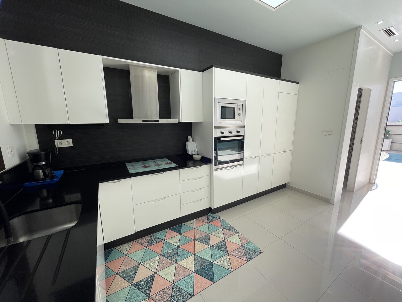 Well-maintained and stylish semi-detached house in the charming Entre Golf, one of Villamartín’s most appreciated and quiet urbanisations.Situated in the quiet and private Bidasoa street, in walking distance to restaurants, cafes, supermarkets and a short drive to the popular Villamartin Plaza and La Fuente. Also a short drive to several golf courses, including Villamartin golf. Bright & SpaciousThe bright and very big living room connects seamlessly to the open-plan kitchen and the sunny, south facing terrace. There is also a separate toilet, ideal for guests.You have your own private pool with heat pump, low maintenance garden and possibility to park on the plot.Several neighbours have chosen to convert the dining area into an extra bedroom – the possibilities are many.Upstairs you find two spacious double bedrooms, both with built-in wardrobes and a private balcony – ideal for starting your morning with a cup of coffee. The bright, fully tiled bathroom is equiped with a spacious shower.On the solarium awaits a wonderful roof terrace with breathtaking views of the area,. Move-In Ready & FurnishedThe apartment is sold furnished with stylish interior furniture, accessories, and practical household items – simply bring your suitcase and start living. Prime Location in Villamartin – Los AltosLos Altos is known for its peaceful atmosphere, excellent amenities, and proximity to beaches, shops, and restaurants. A perfect combination of space, comfort, and Mediterranean charm. In addition to your own private pool, you also have access to the urbanization’s communal pool area, located just a few meters further at the end of street. It is very well maintained, with real grass, parasols and pétanque court. This is a property that appeals to both permanent residents and holidaymakers, and it is sold exclusively through us. Contact us today to arrange a viewing of this gem in a prima location!