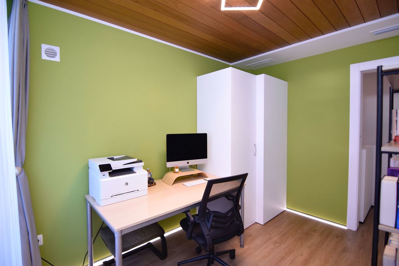 The ground floor features a bright and spacious living area, a modern guest WC, and a large fully renovated kitchen with dining space and excellent storage. The upper floor comprises two further bedrooms, a contemporary shower room, and a dedicated office with direct access to a private terrace, perfect for working from home or relaxing outdoors.