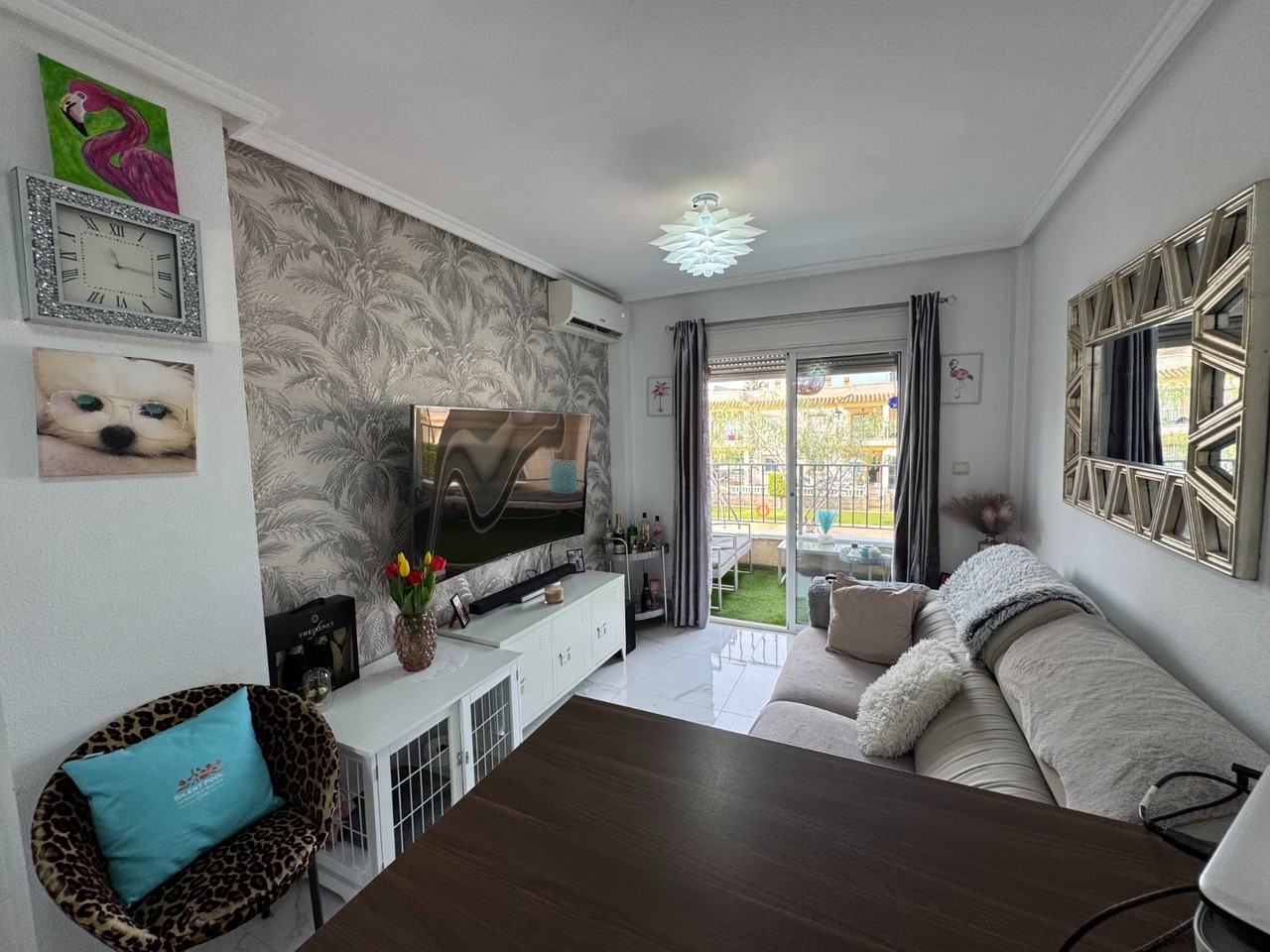 Do not miss this opportunity to acquire a wonderful first-floor apartment in the highly sought-after area of St James Hill. Ideally positioned within a secure community accessed via communal electric gates, this beautifully presented two-bedroom, one-bathroom property offers both comfort and convenience in a prime location.Upon entering the apartment, you are welcomed into a bright and spacious open-plan living area, seamlessly connected to a fully fitted modern kitchen with integrated utilities. Large windows and patio doors flood the space with natural light and lead directly onto a private terrace overlooking the communal swimming pool, creating a bright and airy atmosphere ideal for relaxation and entertaining.The property benefits from hot and cold air conditioning throughout and is south-facing, ensuring year-round comfort and excellent sunlight. The apartment is fully furnished with high-quality furniture, fixtures, and fittings, complemented by elegant white porcelain flooring throughout.The smaller bedroom is generously sized and currently accommodates a king-size bed, while also being well-suited to a standard double. It features a large window allowing ample natural light. The stylish bathroom includes a walk-in shower and a modern vanity unit. The larger bedroom includes fitted wardrobes is also south-facing, and offers views over the communal pool area, and .A standout feature of this property is the private rooftop solarium, fully equipped with a bar and sunbathing area—perfect for enjoying beautiful Mediterranean summer evenings.Additional benefits include a designated private parking space. This apartment is ideal as a permanent residence, a holiday home, or a lock-up-and-leave investment with excellent rental potential.The location is exceptional, with La Fuente Commercial Centre within walking distance, offering a wide range of bars, restaurants, pharmacies, and supermarkets. Three renowned golf courses are also located nearby.A truly beautiful apartment that must be seen to be fully appreciated.