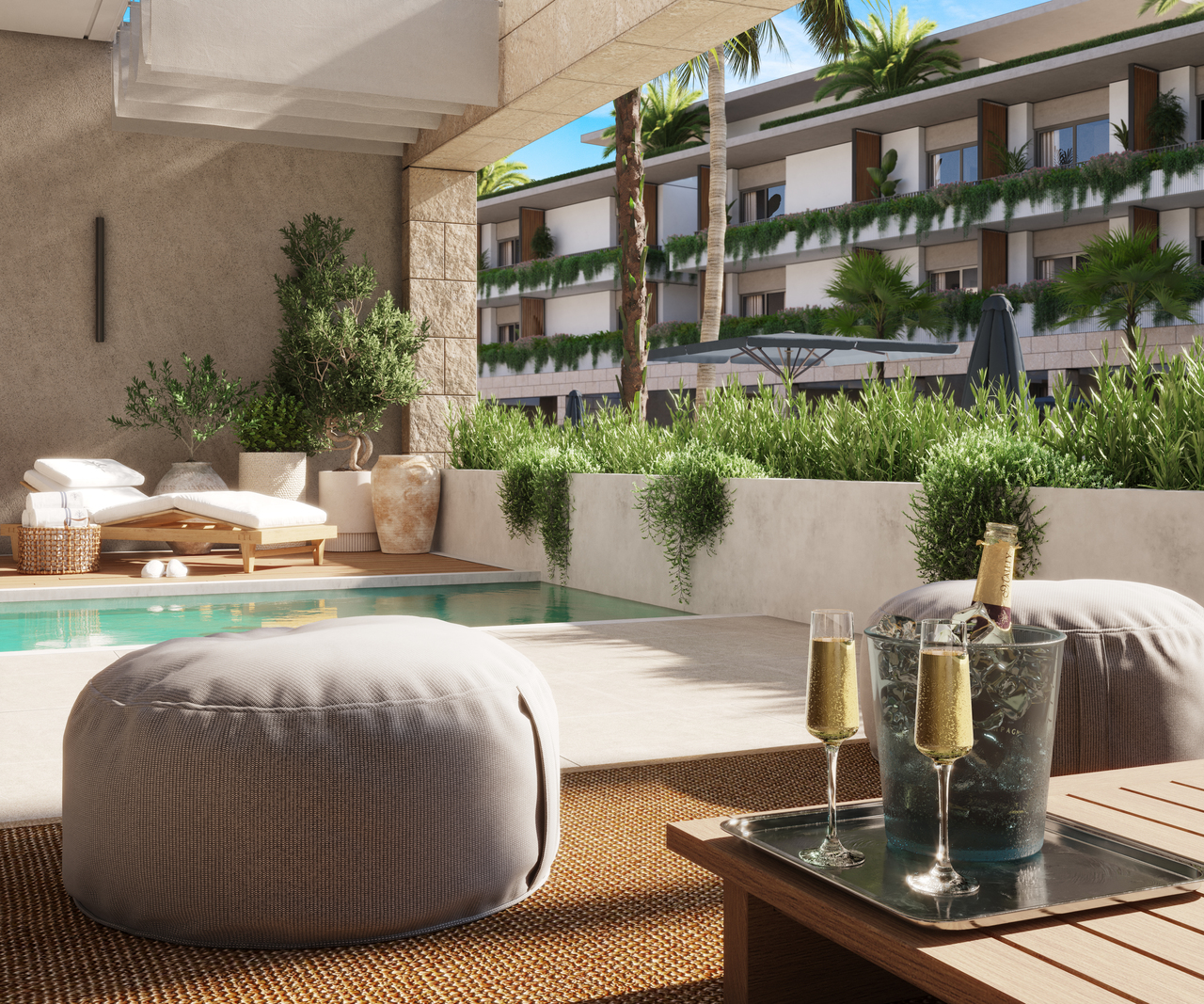 Residents benefit from multiple swimming pools with lounge and sunbeds, BBQ and picnic spaces, pet parks, children’s play areas, and wellness zones including a gym. Many units feature private terraces, balconies, or gardens with scenic views, enhancing outdoor living.