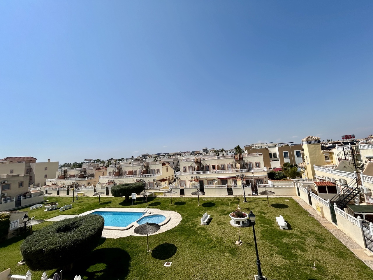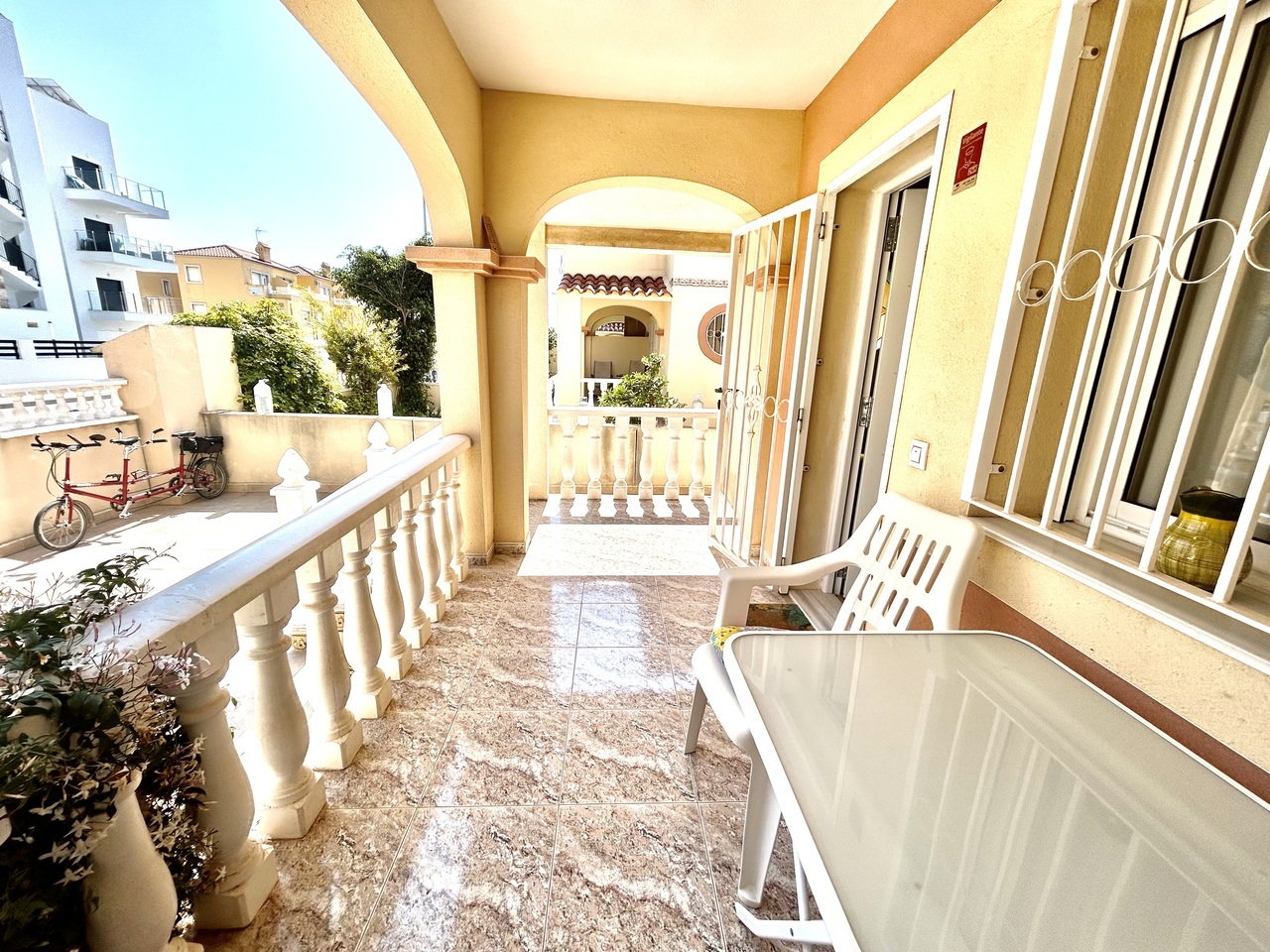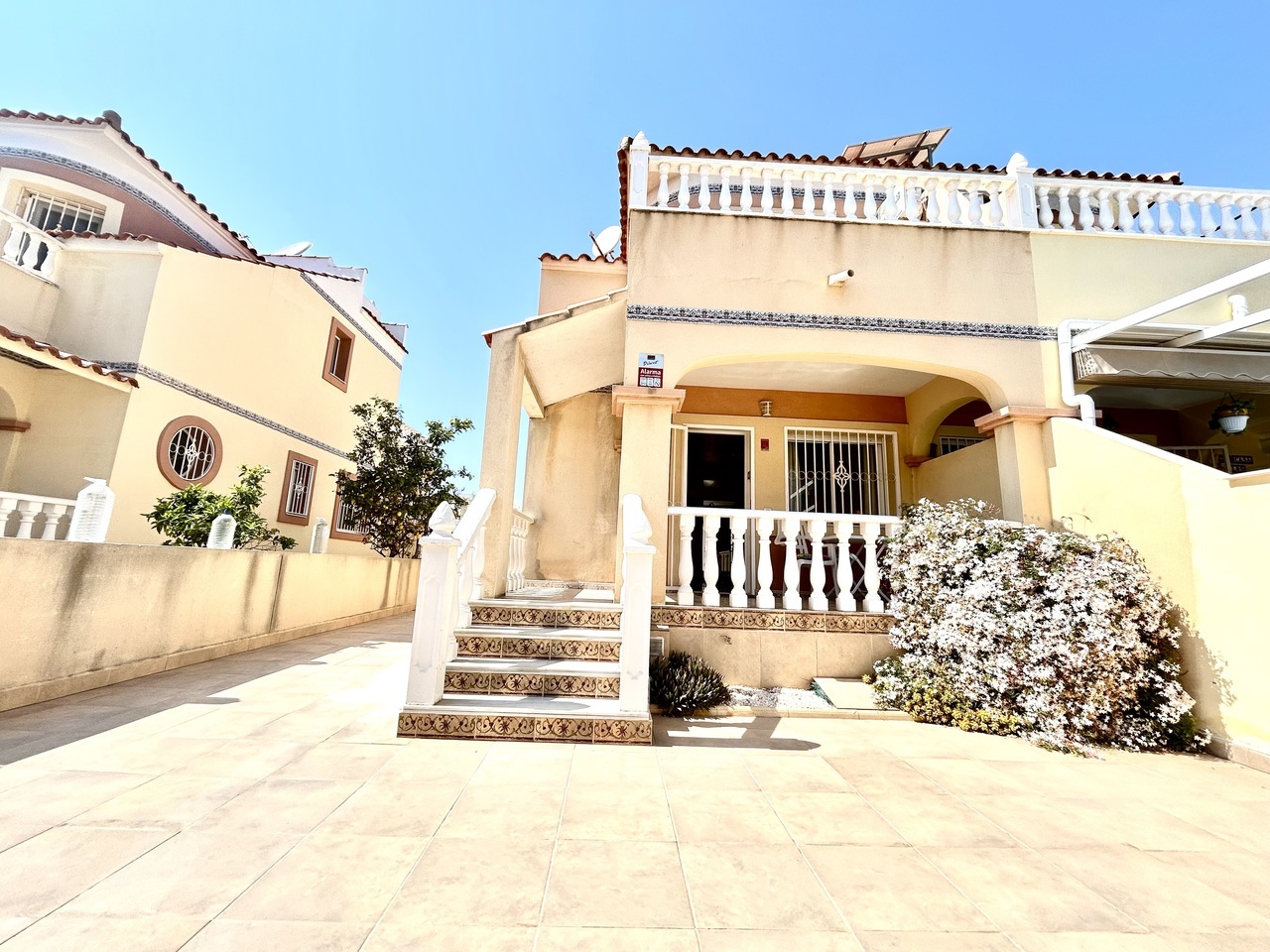 Discover this charming 3-bedroom, 2-bathroom semi-detached townhouse ideally located within walking distance of La Zenia Boulevard, offering the perfect blend of convenience, comfort, and Mediterranean outdoor living.At the front of the property, a sun-drenched private garden provides ample space not only for relaxing but also for secure off-road parking. To the rear, a spacious terrace opens directly onto the beautifully maintained communal pool area, creating a seamless indoor-outdoor lifestyle perfect for entertaining, sunbathing, or enjoying family time.The ground floor features a bright and welcoming living and dining area, a fully equipped kitchen, and a convenient double bedroom, ideal for guests or single-level living.Upstairs, you’ll find two generous bedrooms, each with its own private terrace, offering peaceful spots to enjoy morning coffee or evening sunsets. One of the terraces provides access to a private solarium, delivering additional outdoor space and panoramic views—perfect for soaking up the year-round sunshine. A well-appointed bathroom serves this level.Whether you’re searching for a permanent residence, holiday retreat, or investment property, this home offers an unbeatable location, fantastic outdoor spaces, and direct access to communal amenities—all just moments from shops, restaurants, and beaches.