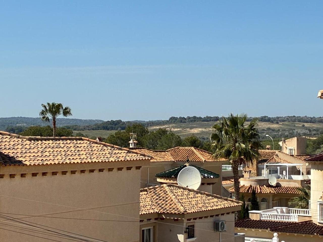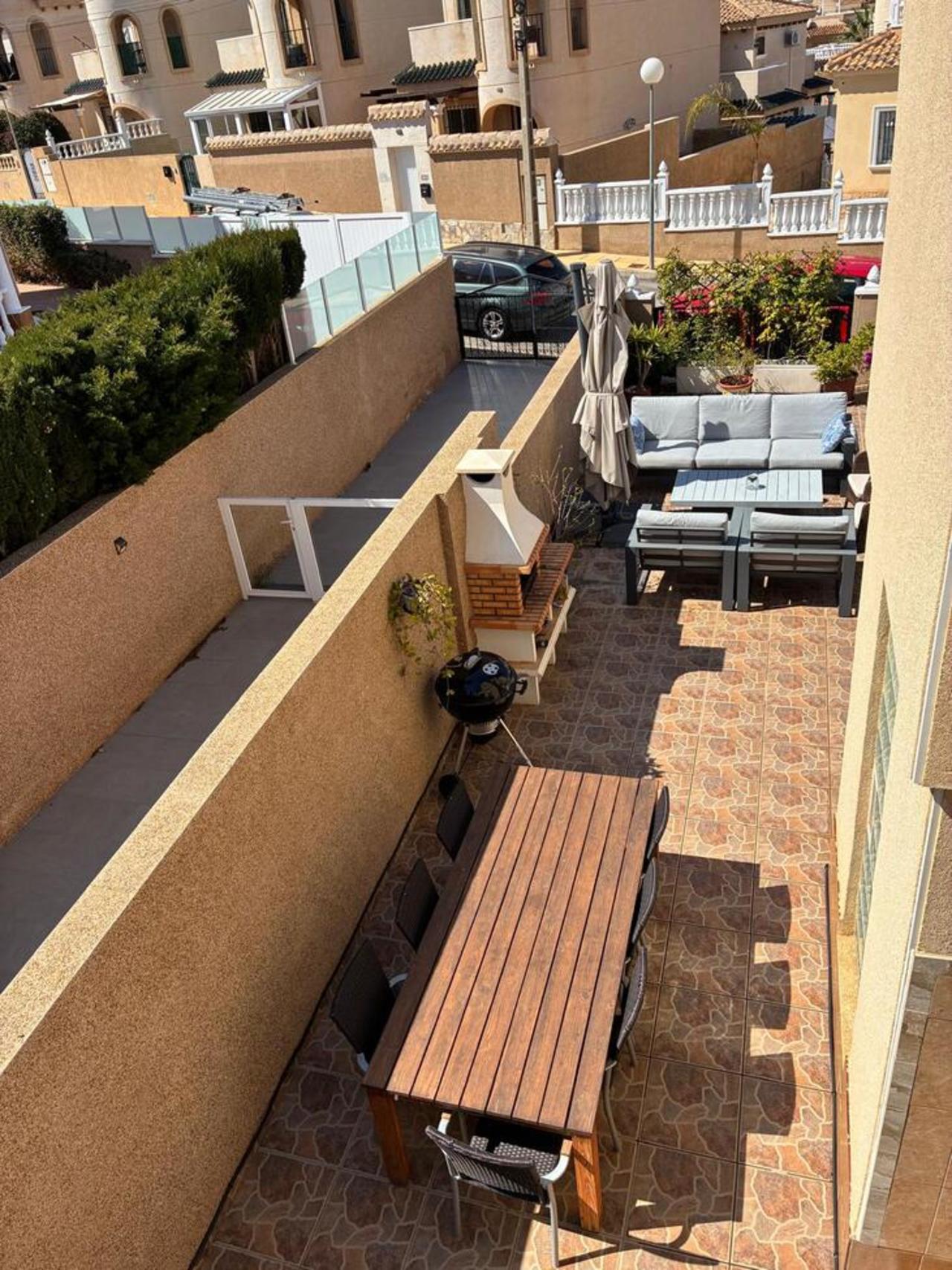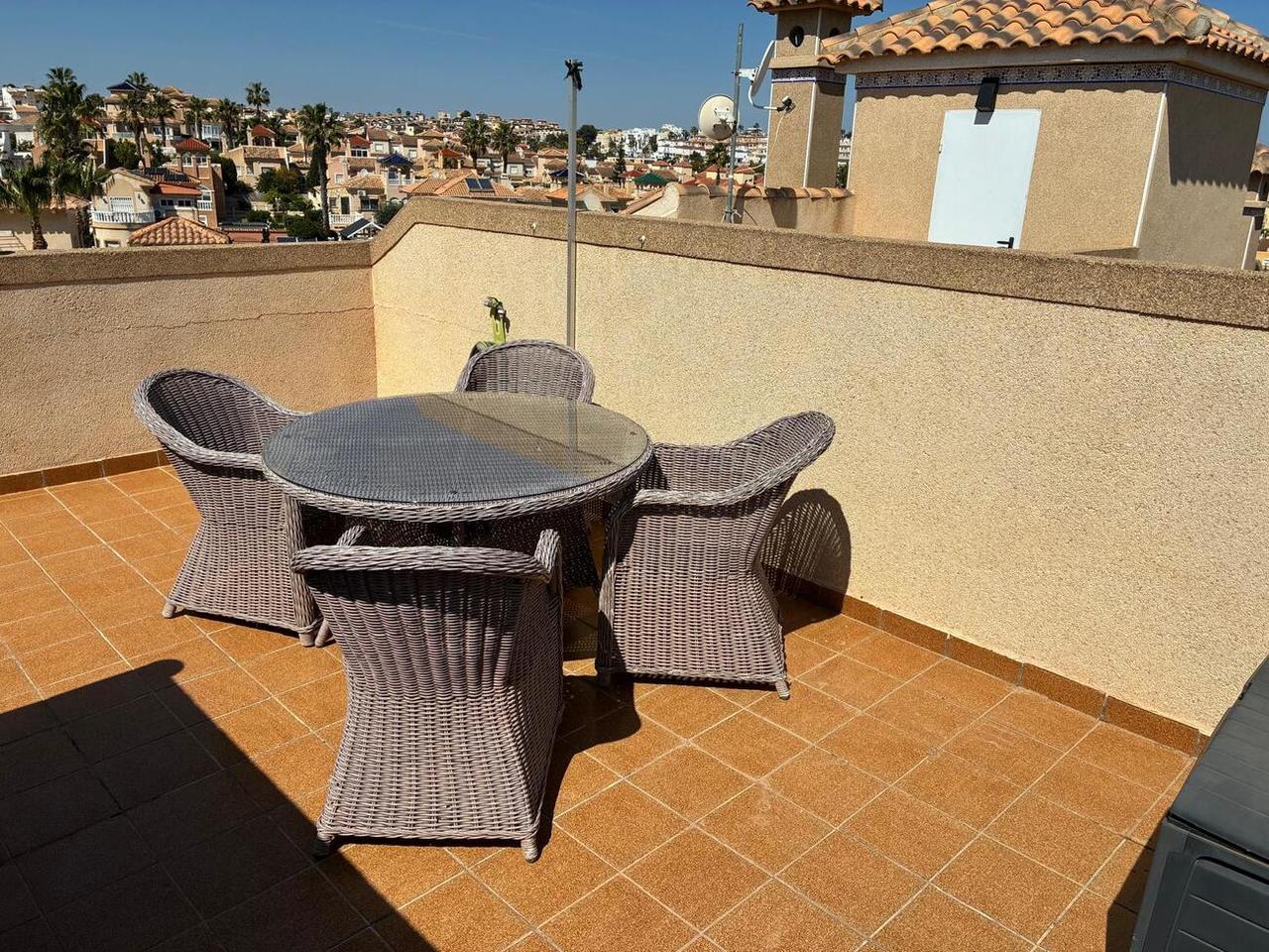 Exclusively for sale with AT HOME Real EstateThis beautiful and well-maintained home is built over two levels and offers a comfortable and functional layout.On the ground floor, you will find a fully equipped kitchen open to the bright living area, along with a bedroom and a bathroom. Upstairs, there are two additional bedrooms—one of which features a private balcony—and a second bathroom. From this level, a terrace leads to the private solarium, where a storage room is currently used as an additional guest bedroom.The outdoor area is very inviting, offering several terraces, a private parking space, and enough room to install your own private swimming pool if desired.The property benefits from air conditioning in the living room and in one of the bedrooms and is sold fully furnished, making it ready to move into.The residential complex features a beautiful communal swimming pool and is ideally located within walking distance (approx. 1 km) to all amenities. Several golf courses are nearby, the stunning beaches of the Costa Blanca are just 6 km away, and Alicante Airport is approximately 55 km from the property.This home is perfect as a holiday retreat, permanent residence, or an excellent rental investment.