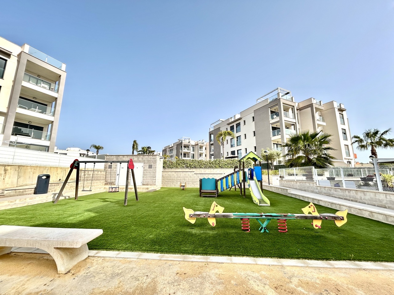 Discover stylish Mediterranean living in this beautifully presented 2-bedroom, 2-bathroom apartment located in the sought-after Valentino Golf complex in Villamartín.This modern home offers a bright and airy open-plan layout, designed to maximize natural light and create a seamless flow throughout the living spaces. The spacious lounge opens onto a private balcony, where you can unwind while enjoying picturesque views over the lush communal gardens and sparkling pools—perfect for soaking up the relaxed Costa Blanca lifestyle.The standout feature is the private solarium, offering an additional sun-drenched space ideal for entertaining, sunbathing, or simply enjoying panoramic views in complete privacy—your own rooftop retreat under the Spanish sun.The master bedroom is a true sanctuary, featuring a private en-suite bathroom and direct access to the balcony, allowing you to wake up to tranquil views each morning. A second well-proportioned bedroom and a contemporary family bathroom complete the interior.Residents of this popular gated community benefit from exceptional on-site amenities, including multiple swimming pools, a tennis court, and a children’s playground—ideal for both families and holidaymakers alike. The property also includes a generous private parking space in the underground garage, offering both convenience and security.Whether you’re looking for a permanent residence, a holiday home, or a smart investment, this apartment combines comfort, location, and lifestyle in one of Villamartín’s most desirable developments