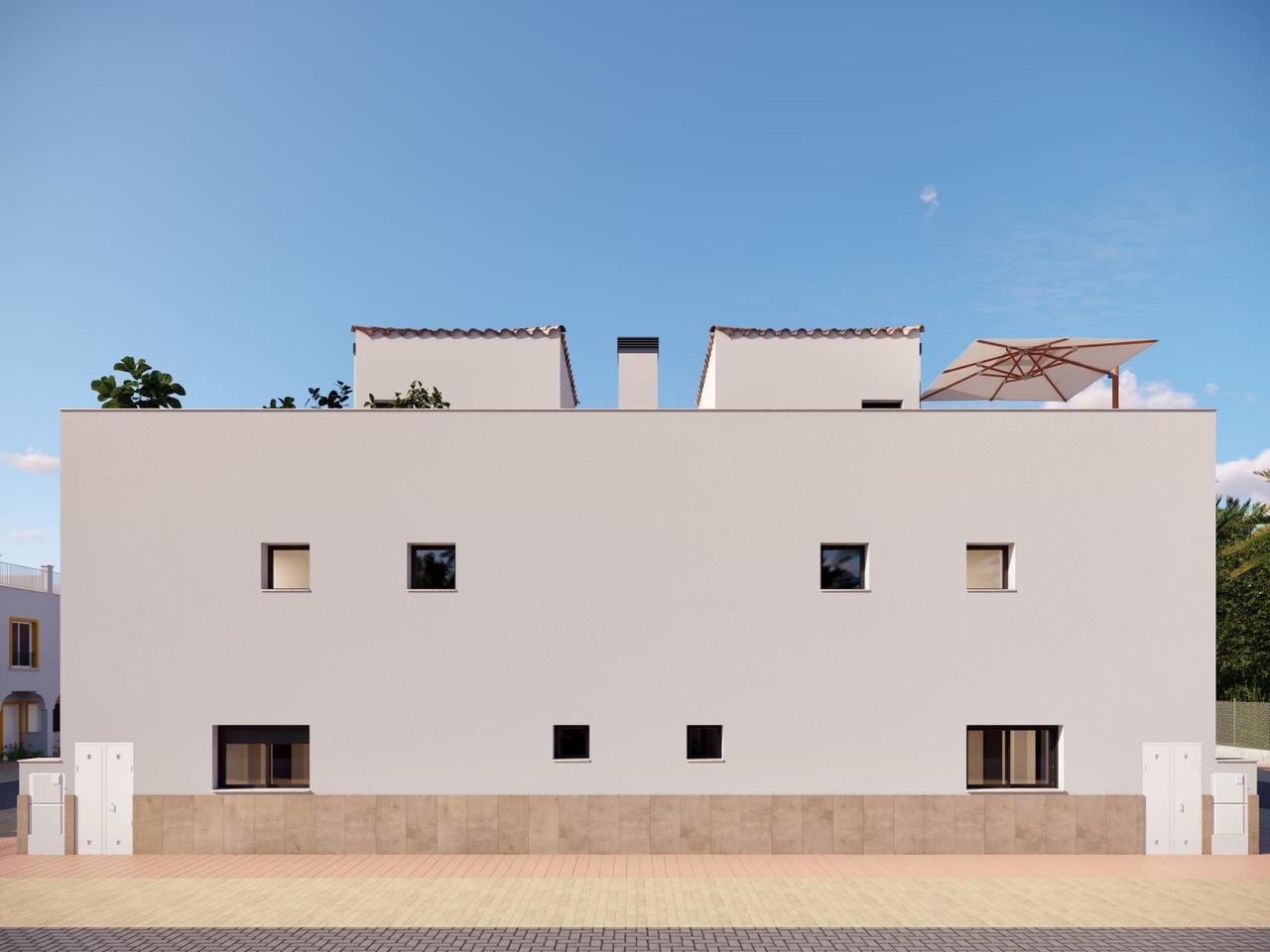 Modern Townhouses Near Golf Courses in Santa Rosalia-Murcia New Build Homes in a Peaceful Village Setting Discover this attractive new development of contemporary townhouses located in the charming village of Santa Rosalia in the Region of Murcia. Surrounded by some of the most prestigious golf courses in the area and just a short drive from the beaches of the Mar Menor, this location offers the perfect combination of tranquility, convenience and outdoor lifestyle. Santa Rosalia is a traditional Spanish village with a welcoming atmosphere, where residents can enjoy local shops, a supermarket, bars and restaurants including the popular La Almazara. Its strategic position between Roda Golf, Mar Menor Golf and Los Alcazares makes it highly desirable for both permanent living and holiday homes. Stylish Townhouses with Solarium and Outdoor Living The development consists of 18 modern townhouses with 2 or 3 bedrooms and 2 bathrooms, designed with a contemporary open plan layout. Each home features a bright living and dining area connected to a fully fitted kitchen with appliances, creating a functional and comfortable living space. All properties include a private rooftop solarium with a summer kitchen, ideal for enjoying the Mediterranean climate, entertaining guests or relaxing outdoors throughout the year. In addition, each home benefits from a private parking space and a storage room located in a communal garage. Quality Finishes and Modern Features These homes are built with high quality materials and designed to offer comfort and energy efficiency. Features include an aerothermal system for hot water, pre installation for ducted air conditioning, and fully equipped bathrooms with furniture, mirrors and shower screens. The development also includes a communal swimming pool, providing a perfect space to relax and enjoy sunny days in a peaceful environment. Prime Location Close to Golf and the Sea Santa Rosalia is ideally located just 4.5 km from the beaches of Los Alcazares, known for their calm waters and long promenade along the Mar Menor. The surrounding area is a paradise for golf lovers, with several top courses just minutes away. The nearby town of Los Alcazares offers a wide range of services, restaurants, shops and leisure activities, making daily life easy and enjoyable. Distances to Key Points of Interest Los Alcazares beaches 4.5 km Roda Golf 3 km Mar Menor Golf 4 km Cartagena 25 km Murcia International Airport 30 km Your Ideal Home on the Costa Calida This development offers an excellent opportunity to own a modern townhouse in a well connected and peaceful location near golf courses and the sea. Contact us today to receive more information or arrange a visit and secure your new home in Santa Rosalia.